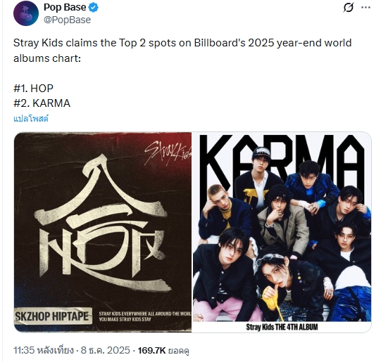 🔥 Stray Kids ครองชาร์ต Billboard Year-End World Albums อีกครั้งในปี 2025 โดยครองได้อันดับ 1 มา 3 ปีติดแล้ว และปีนี้ครองทั้งอันดับ1และ2เป็นปีที่2ติดกันอีกด้วย