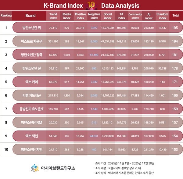“ในการจัดอันดับบอยกรุ๊ป K-Brand Index ประจำปีนี้ วี จากวง BTS ก้าวขึ้นสู่อันดับ 1 สิ่งนี้สามารถมองได้ว่าเป็นผลมาจากดัชนีที่สะท้อนถึงพลังในการเผยแพร่เนื้อหาและโครงสร้างการมีส่วนร่วมของแฟนๆ ทั่วโลกโดยตรง มากกว่าความถี่ของกิจกรรม”