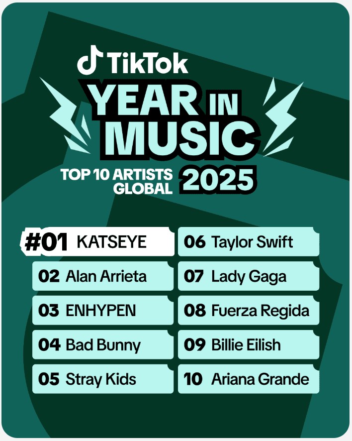 ตามรายงานสรุปปี 2025 ของ TikTok ที่ประกาศเมื่อวันที่ 9 ธันวาคม 2025 ได้ประกาศรายชื่อศิลปินยอดนิยมระดับโลก 10 อันดับแรก โดยวัดจากยอดวิว วิดีโอที่สร้างจากเพลง และการมีส่วนร่วมบนแพลตฟอร์ม
