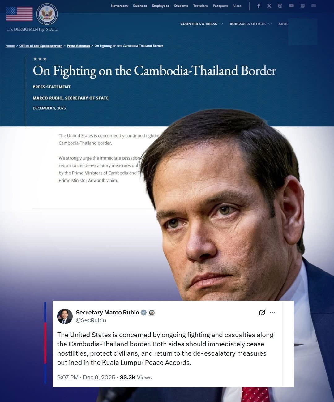 ด่วน!! กระทรวงต่างประเทศสหรัฐ และมาร์โก รูบิโอ รัฐมนตรีว่าการกระทรวงต่างประเทศสหรัฐ แถลงการเรียกร้องให้ไทยและกัมพูชายุติการสู้รบโดยทันที และกลับไปใช้ข้อตกลงตามที่ระบุไว้ในข้อตกลงสันติภาพที่ กัวลาลัมเปอร์