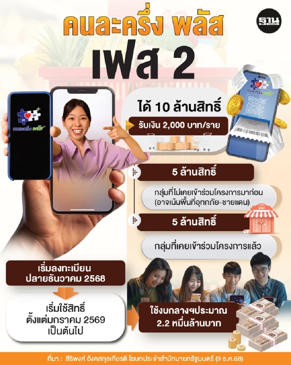 เช็กเงื่อนไขคนละครึ่งเฟส 2 จำนวน 10 ล้านสิทธิ์ ในที่สุดคนละครึ่งเฟส 2 เริ่มมีสัญญาณชัดเจนเพิ่มขึ้นตามลำดับ เมื่อ นายสิริพงศ์ อังคสกุลเกียรติ โฆษกประจำสำนักนายกรัฐมนตรี ออกมาเปิดเผยว่า กระทรวงการคลัง เตรียมเสนอคณะรัฐมนตรี (ครม.) ในสัปดาห์หน้า (วันอังคารที่ 16 ธันวาคม 2568 ) เพื่อขออนุมัติโครงการ “คนละครึ่ง พลัส” เฟส 2 เพื่อกระตุ้นการใช้จ่ายอย่างต่อเนื่องในปี 2568 โดยคาดว่าจะให้จำนวน 10 ล้านสิทธิ วงเงินคนละ 2,000 บาท เปิดให้ลงทะเบียนในช่วงปลายเดือนธันวาคม 2568 และเริ่มใช้จ่ายได้ในเดือนมกราคม 2569
