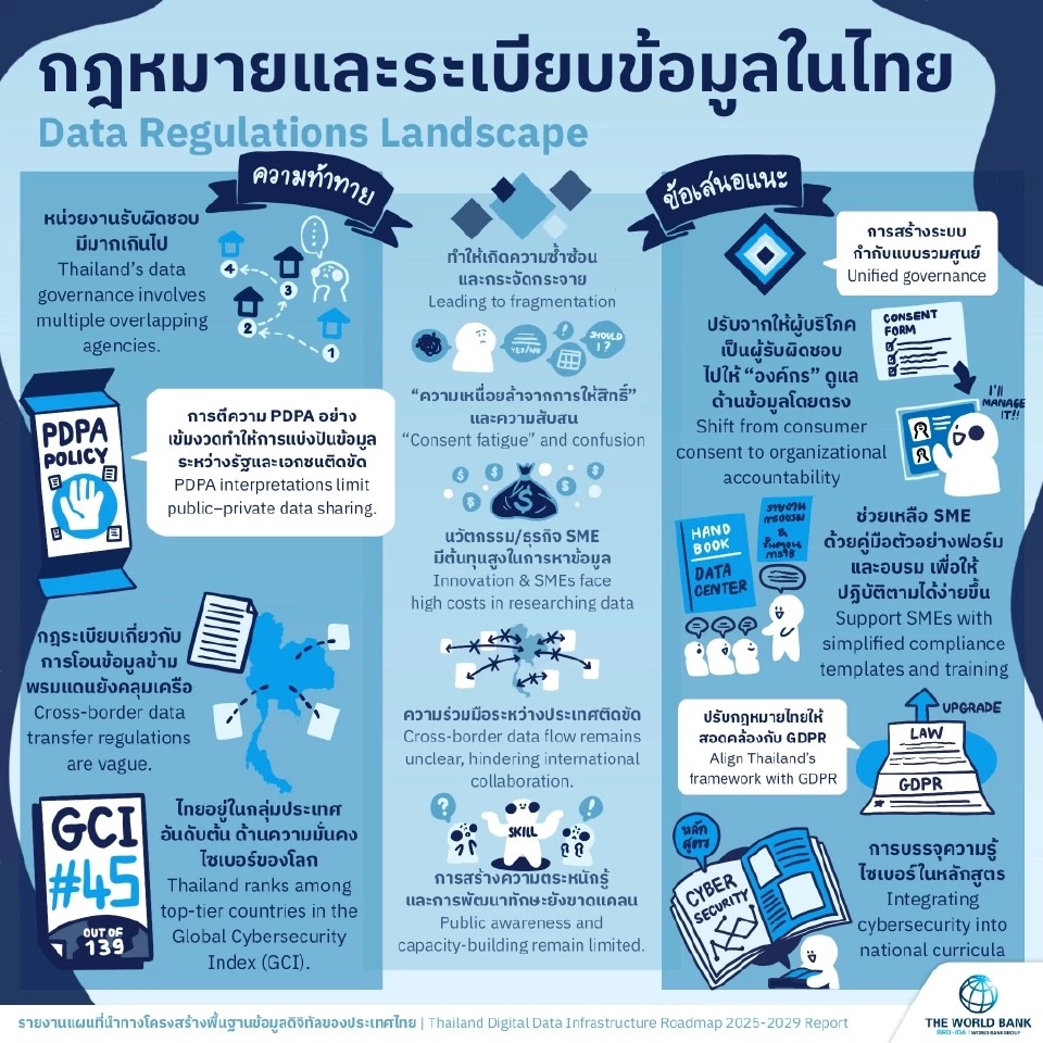 ธนาคารโลกได้สรุป "7 ประเด็นติดล็อก" ที่เป็นอุปสรรคสำคัญต่อการพัฒนาโครงสร้างพื้นฐานข้อมูลดิจิทัล (Digital Data Infrastructure) ของไทย พร้อมเสนอ Policy Roadmap (2025–2029) เพื่อให้หน่วยงานที่เกี่ยวข้องใช้เป็นแนวทางในการปฏิรูปเร่งด่วน