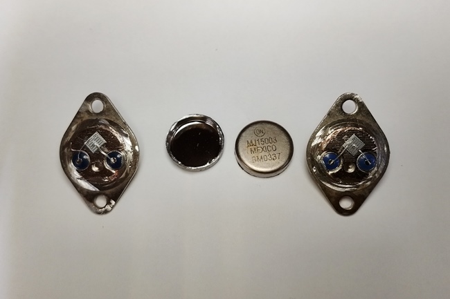 ผมเคยเห็นการเสียของ IC ทรานซิสเตอร์ตัวถังพลาสติกมาก่อนแล้วส่วนใหญ่เมื่อเสียมักจะปรากฏร่องรอยความเสียหายให้เห็น เช่น มีรอยไหม้ ตัวถังปริแตก เป็นต้น ทรานซิสเตอร์ตัวถังเหล็กจานบินเบอร์ MJ2955 2N3055 น่าจะเป็นของปลอมเพราะซิลิคอนเล็กกว่าหัวไม้ขีด ตอนเสียผมผ่าดูก็จะเห็นรอยไหม้เป็นจุดเล็กๆ ในกาวซิลิโคนที่เขาพอกเอาไว้ มาคราวนี้เบอร์ MJ15003 MJ15004 สภาพภายดูดีเหมือนของใหม่เลย มันคงเสียในระดับอนุภาคเล็กมองไม่เห็นด้วยตาเปล่าใช้แว่นขยายส่องดูก็ยังไม่เห็น