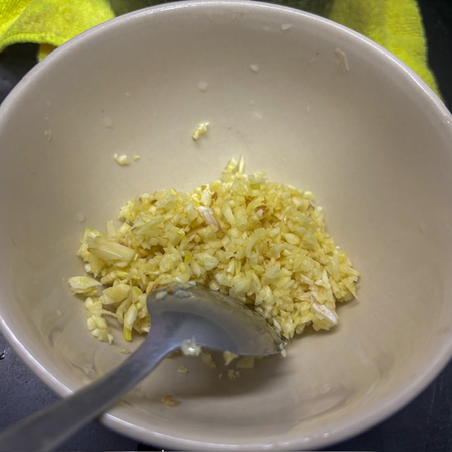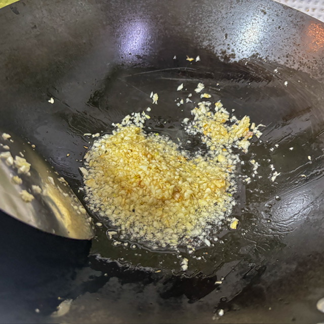 บดกระเทียมและเจียวพอแค่เกือบเหลือง ใช้น้ำมันหมู ใส่เกลือลงนิ๊ดนึง
