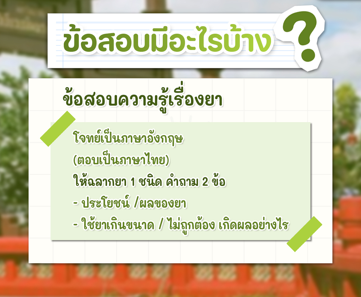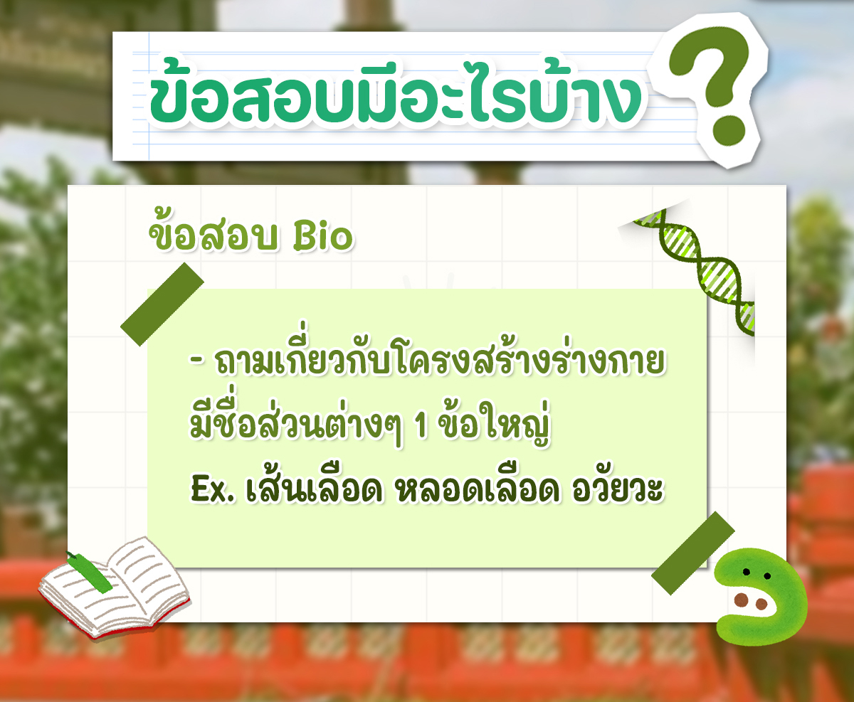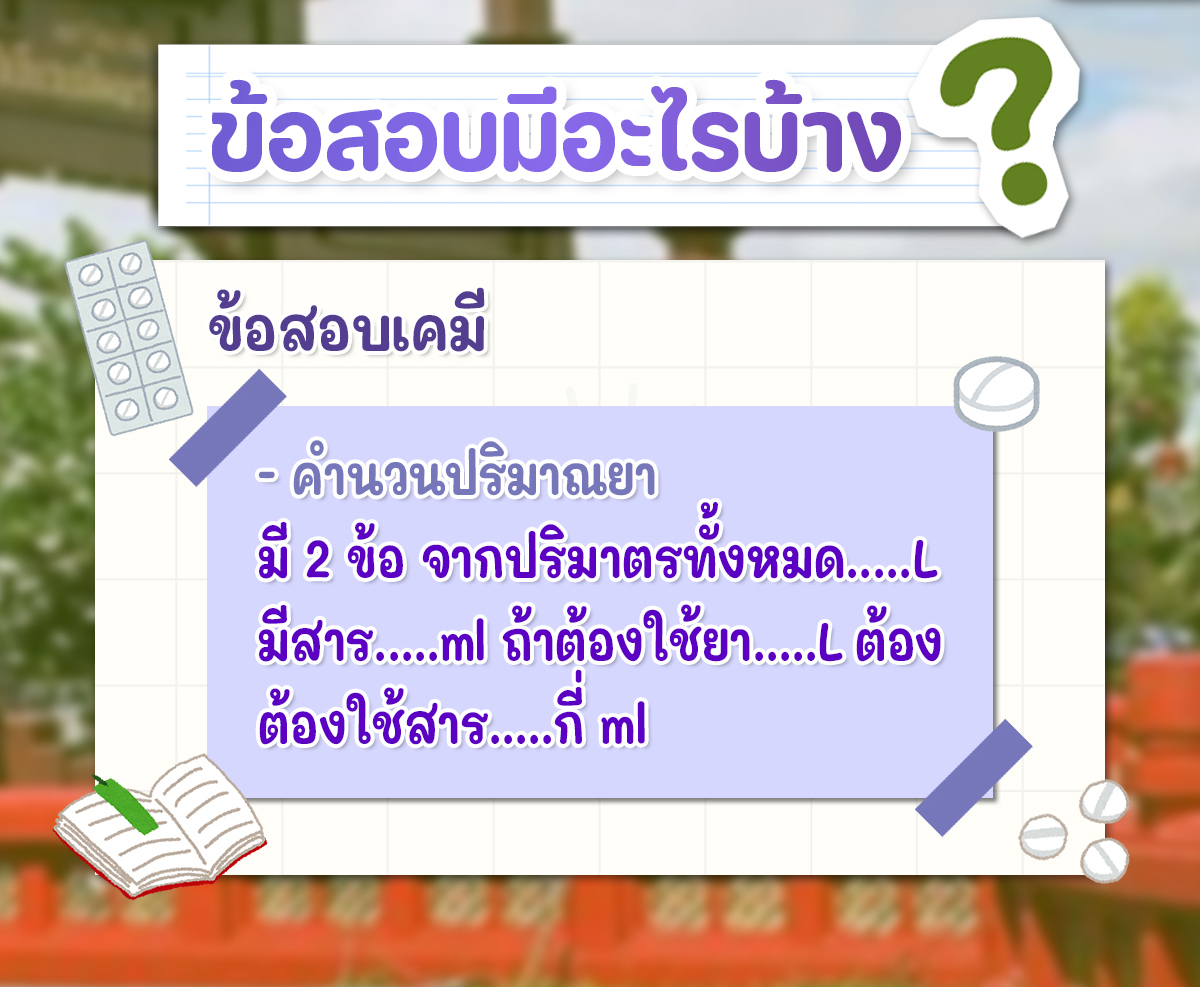 • เนื้อหาข้อสอบ 15 นาทีประกอบด้วยเคมี ชีววิทยา และความรู้เรื่องยา โดยแต่ละส่วนเน้นวัดทักษะที่จำเป็นสำหรับสายสุขภาพ เช่น การคำนวณปริมาณยา การระบุโครงสร้างร่างกาย และการอ่านฉลากยา