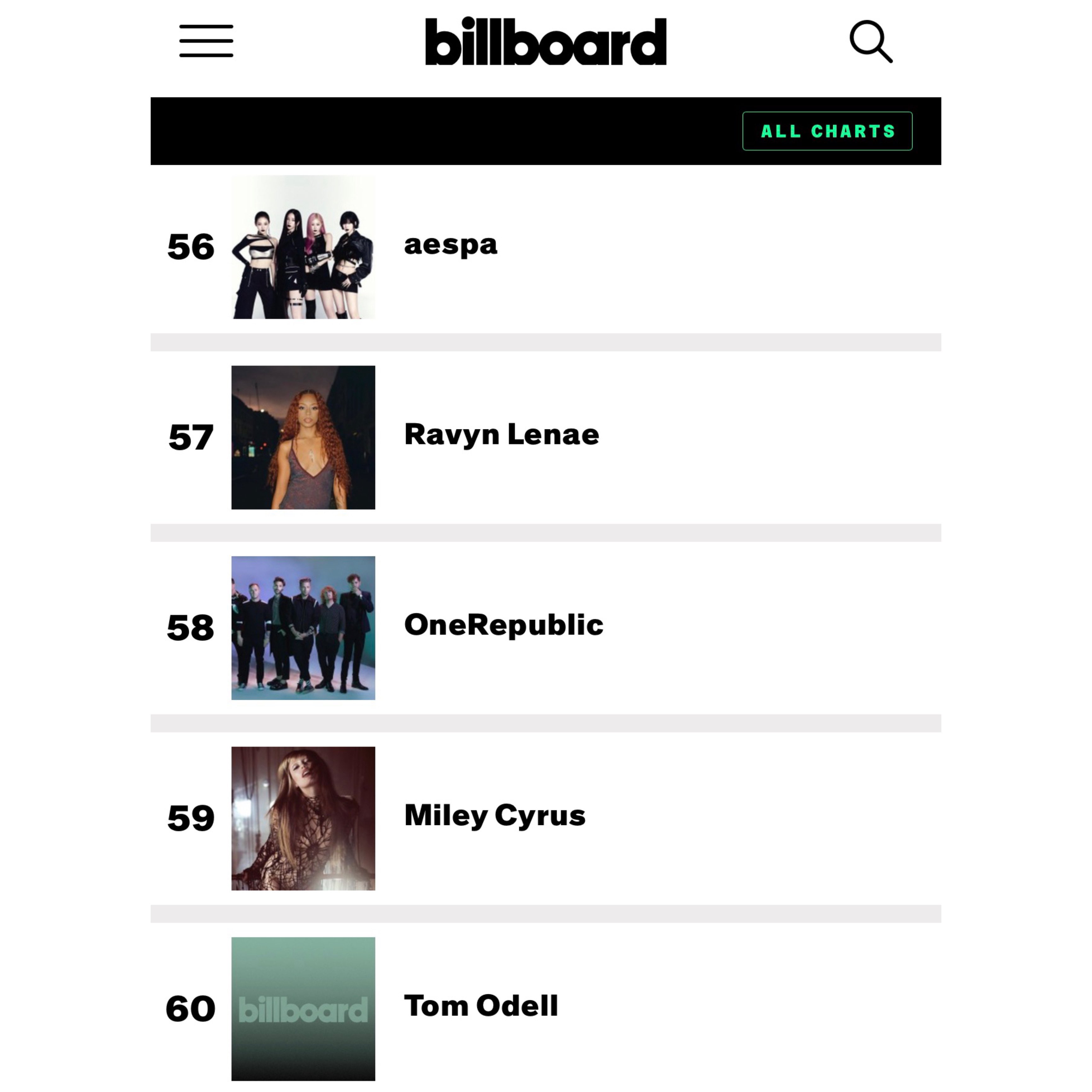 aespa อยู่ในอันดับที่ 56 บนชาร์ต Global 200 Artists ของ Billboard ประจำปี 2025 ซึ่งเป็นอันดับสูงที่สุดของเกิร์ลกรุ๊ปเคป๊อปปีนี้