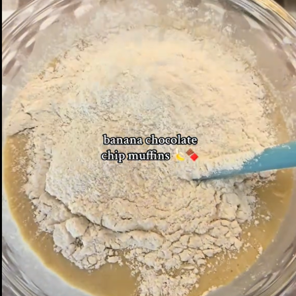 ช็อกโกแลตชิพ (เหลือไว้เล็กน้อยสำหรับโรยหน้า) ลงไป แล้วคนเบาๆ เป็นครั้งสุดท้าย
