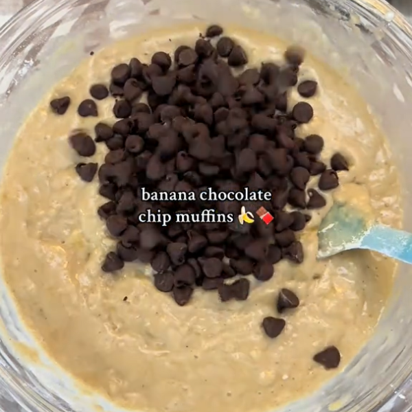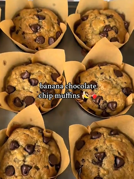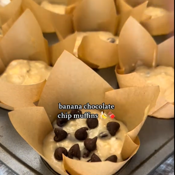 โรยช็อกโกแลตชิพที่เหลือและวางกล้วยแว่นบางๆ บนหน้ามัฟฟิน