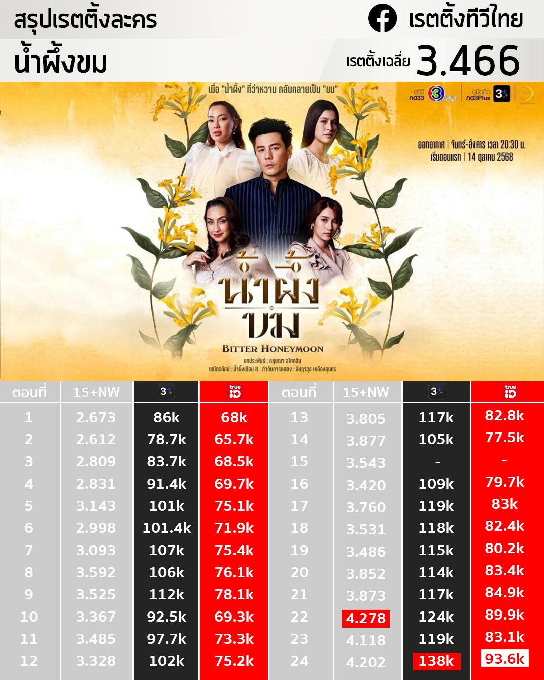 📌 สรุปเรตติ้งละคร #น้ำผึ้งขม ทางช่อง3 🐝✨💛