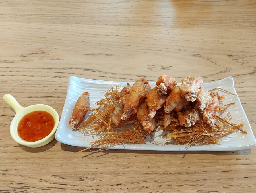 ปีกไก่ทอดสมุนไพร จากการชิมรสและดมกลิ่น น่าจะเป็นตะไคร้หั่นฝอยทอดกรอบ