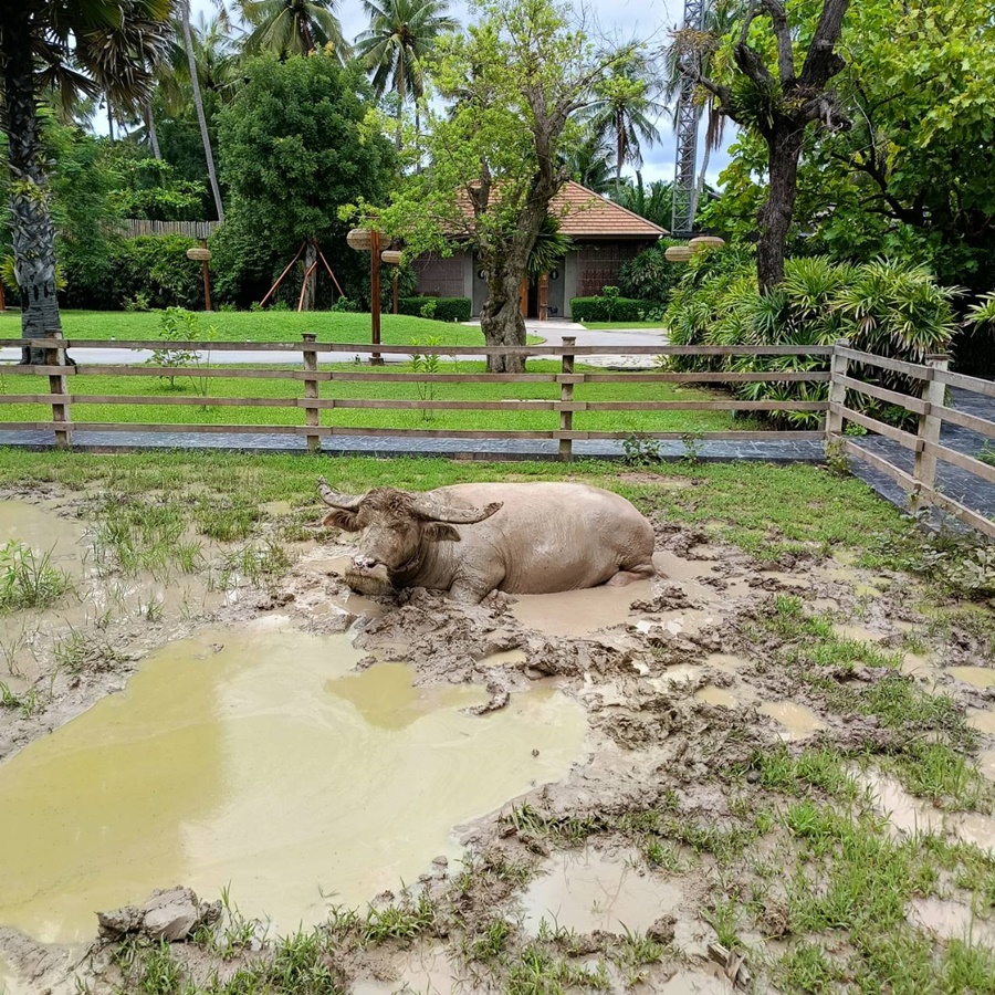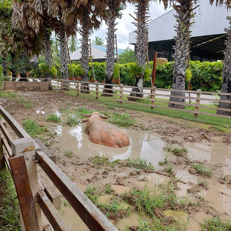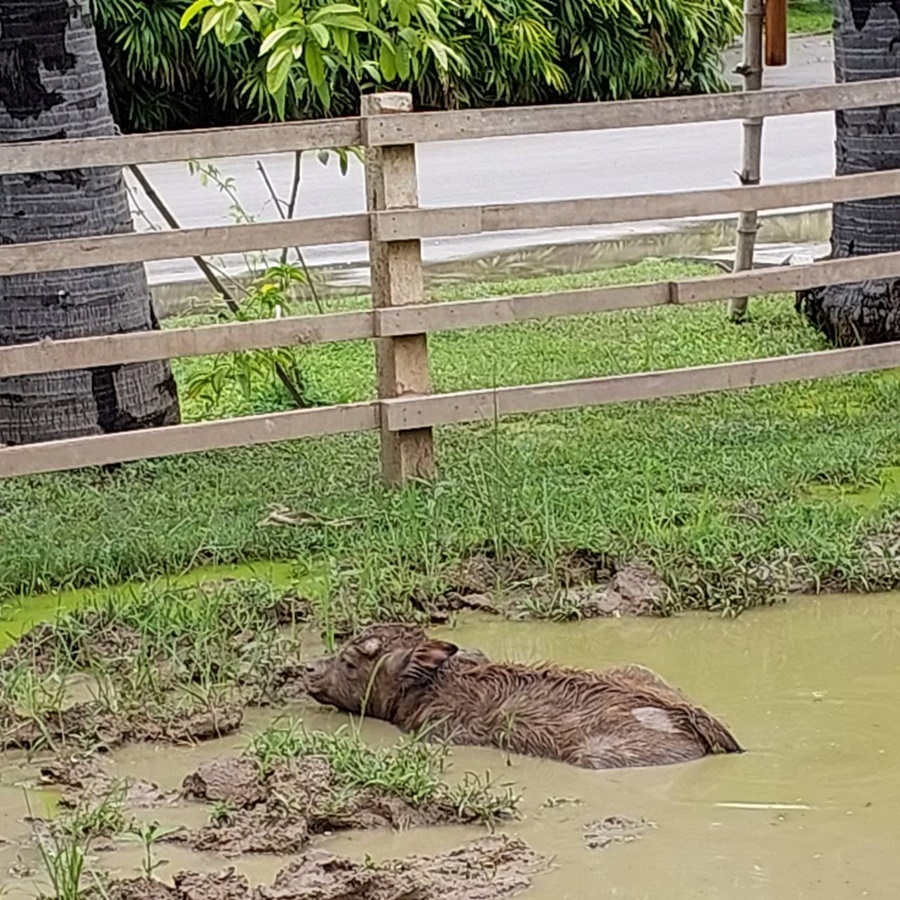 มีน้องควายหน้ามึนๆ นอนอยู่ในบ่อโคลน เรามาหน้าฝนน้ำเยอะเลย
