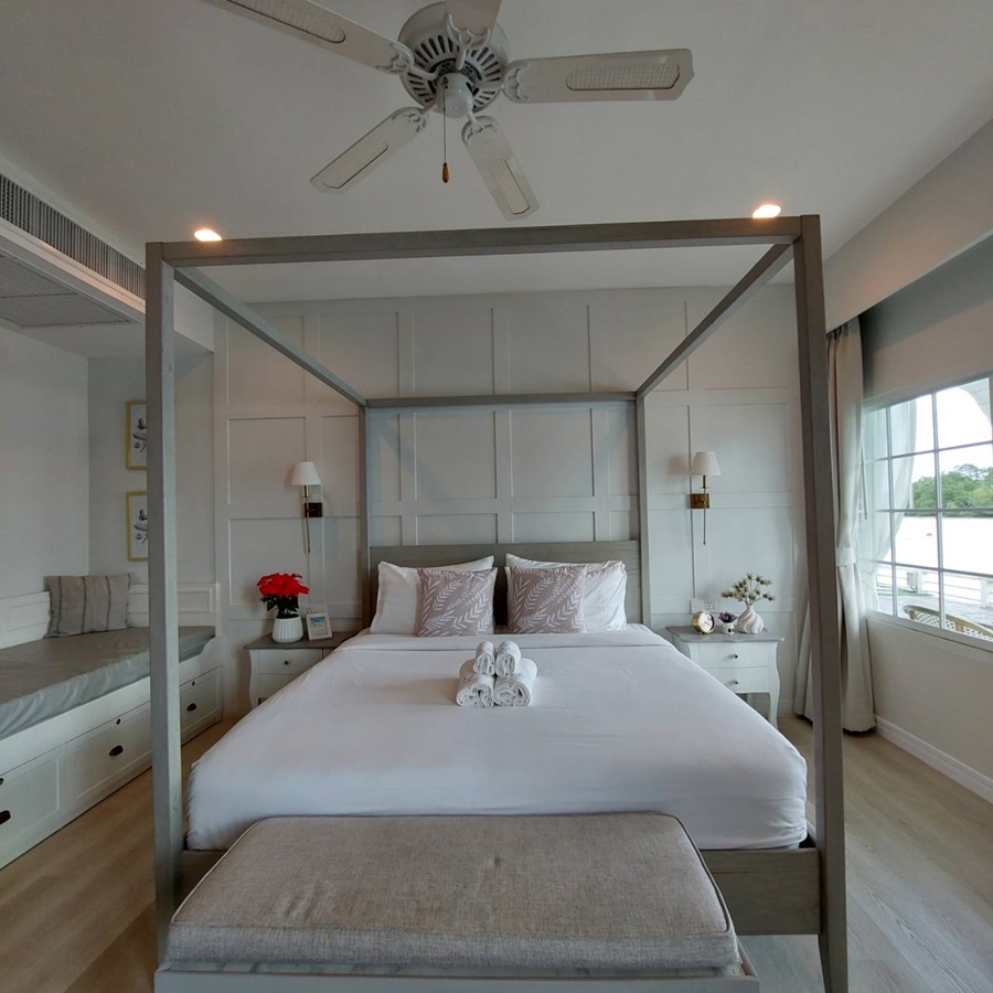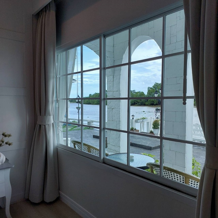 ภายในห้องพัก หน้าต่างบานใหญ่มองเห็นแม่น้ำ