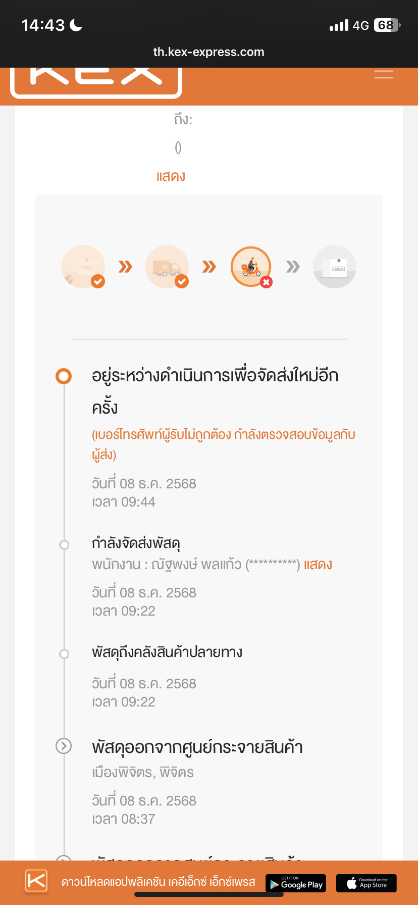 อยู่ระหว่างดำเนินการเพื่อจัดส่งใหม่อีกครั้ง (เบอร์โทรศัพท์ผู้รับไม่ถูกต้อง กำลังตรวจสอบข้อมูลกับผู้ส่ง)