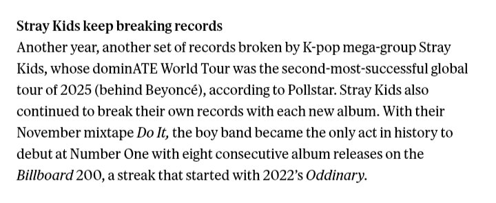 อีกหนึ่งปี อีกหนึ่งสถิติที่ทำลายสถิติโดยวง K-pop mega-group Stray Kids ซึ่งครองแชมป์ World Tour ATE World Tour ประจำปี 2025 และเป็นทัวร์คอนเสิร์ตทั่วโลกที่ประสบความสำเร็จมากที่สุดเป็นอันดับสอง (รองจาก Beyoncé) จากข้อมูลของ Pollstar
