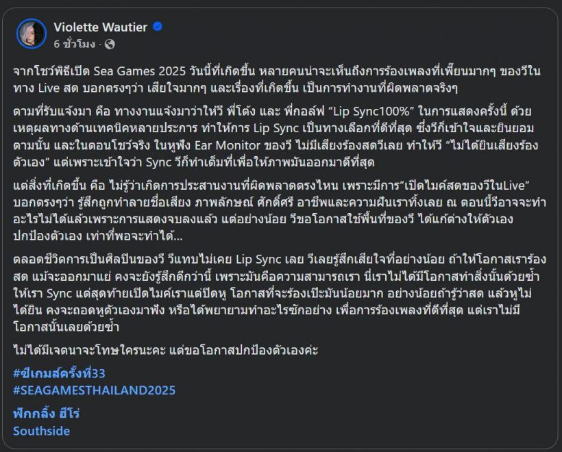 จากกรณีที่ นักร้องสาว วี วิโอเลต ชี้แจงดราม่าเสียงเพี้ยนโชว์พิธีเปิด Sea Games 2025 โดยเผยว่า ตามที่รับแจ้งมา คือ ทางงานแจ้งมาว่าให้วี พี่โต้ง และ พี่กอล์ฟ Lip Sync 100% ตอนโชว์จริง ในหูฟัง Ear Monitor ของวี ไม่มีเสียงร้องสดวีเลย ทำให้วี "ไม่ได้ยินเสียงร้องตัวเอง" และจู่ๆมีการเปิดไมค์สดของวีใน Live ยอมรับว่าเสียความรู้สึก รู้สึกถูกทำลายชื่อเสียง ภาพลักษณ์ ศักดิ์ศรี อาชีพและความฝัน