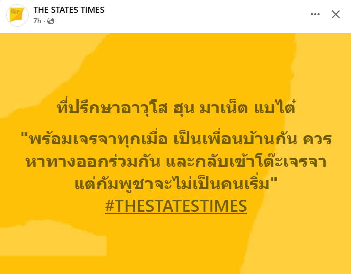 กัมพูชาชาตินักรบ เป็นฝ่ายเปิดก่อน ดังนั้นจะไม่เป็นฝ่ายขอเจรจาสงบศึกก่อน เพราะจะเสื่อมเกียรติ์และเสียศักดิ์ศรี