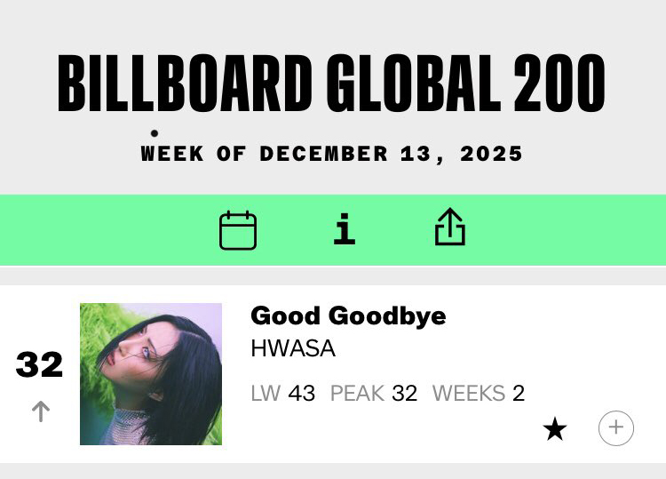 HWASA “Good Goodbye” อยู่ในอันดับที่ #32 บนชาร์ต Billboard Global 200 [สัปดาห์ที่ 2]