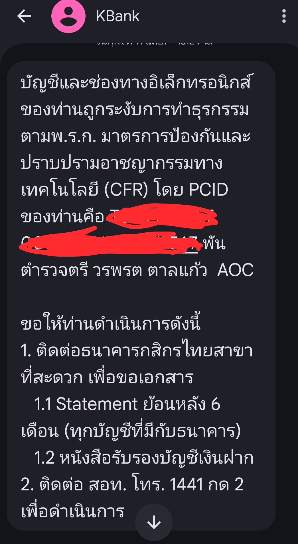 เนื่องจากวันที่ 3 ธันวาคม 2567 ที่ผ่านมา บัญชีของข้าพเจ้าโดนระงับ ชั่วคราวจากกสิกรไทย หลังจากนั้น ข้าพเจ้าก็ติดต่อไปที่ Call Center 02-888-8888 เจ้าหน้าที่
