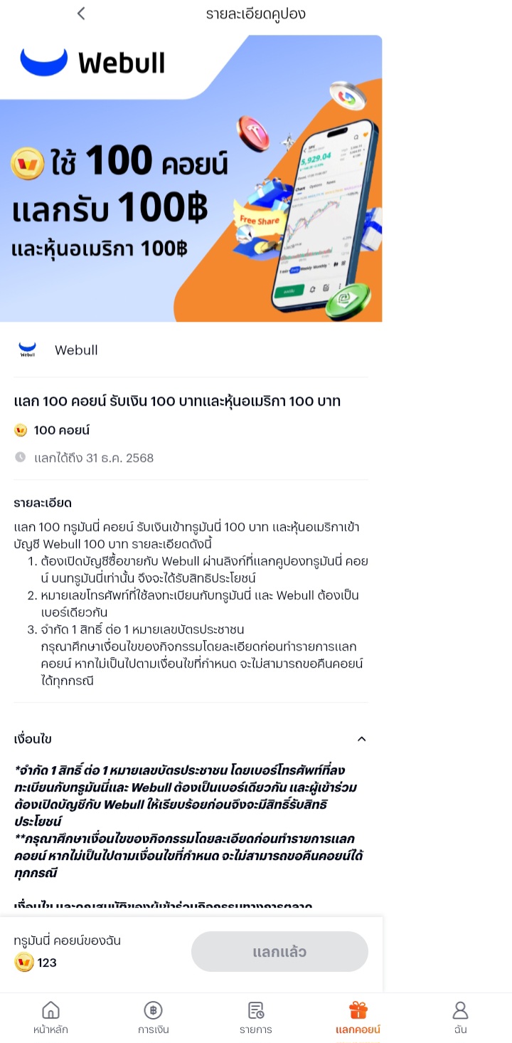 ใช้สิทธิ์coinแลก100coins ซื้อหุ้นอเมริกาผ่านwebullในแอปtrue money wallet