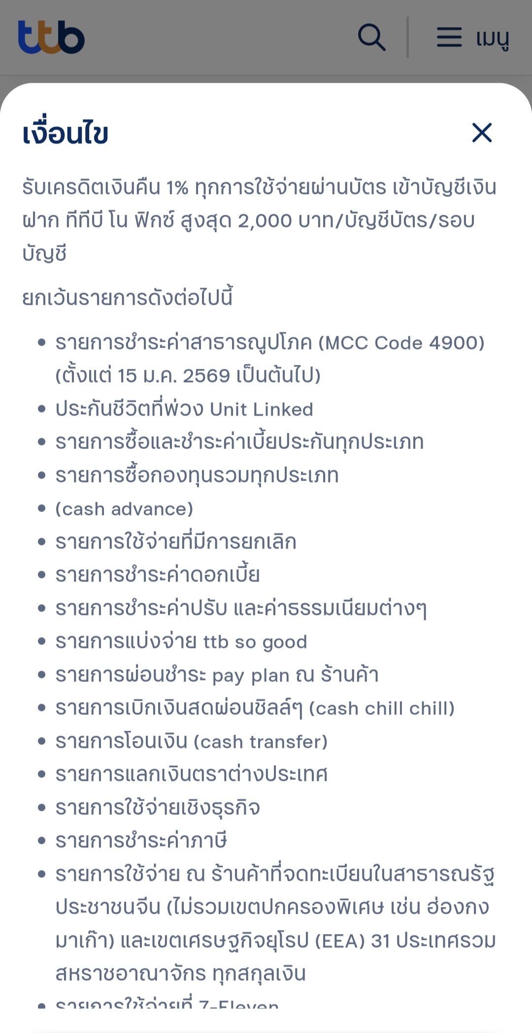 ตอนนี้ค่าน้ำ ค่าไฟ ค่าโทรศัพท์ ค่ามือถือ ค่าinternetบ้านยังอยู่ในเงื่อนไขได้เงินคืน 1% จากบัตรเครดิต ttb so smart รึเปล่าคะ หรือยังไดแต้มจากบัตรเครดิต ttb ไหมคะ เพราะบิลล่าสุดเหมือนจะไม่นำมาคิดเลยค่ะ