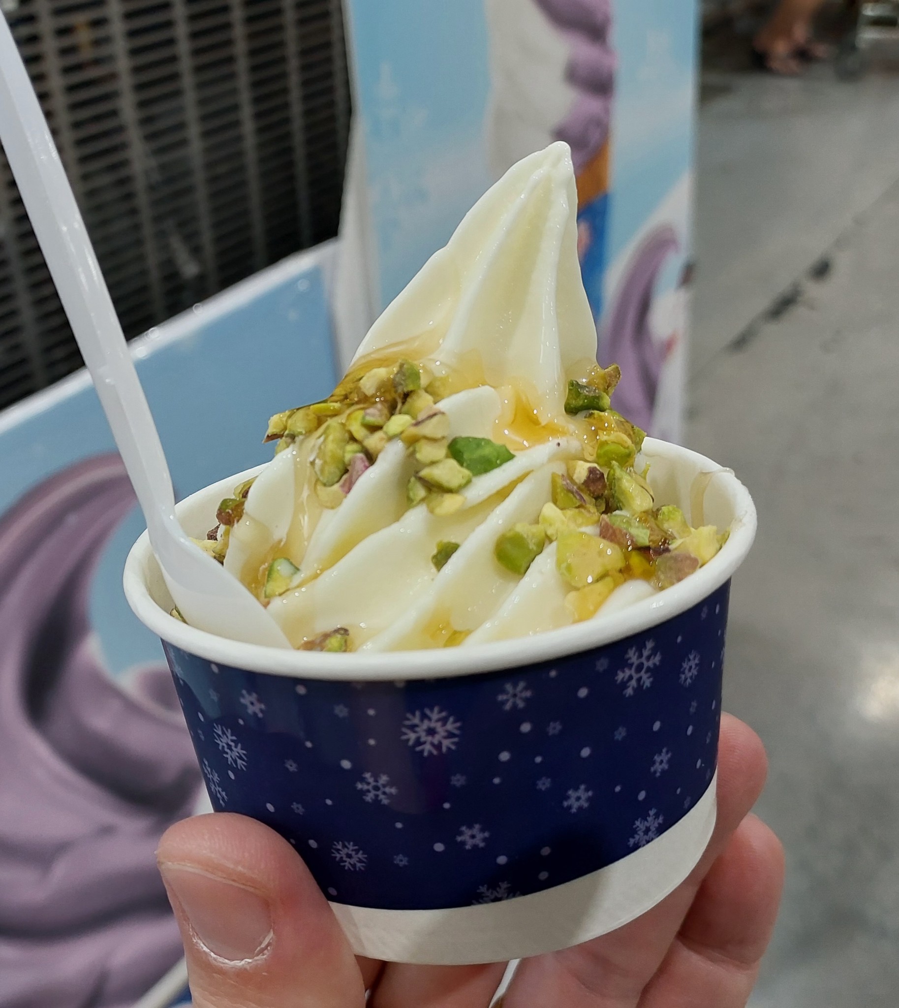 ...เมื่อวานวันหยุด ไปเดินซื้อของแมคโคร เห็นซุ้มขายไอศกรีมsoft serve ของเมจิ เลยได้มีโอกาสได้ลองครั้งเเรก เป็นไอศกรีมโยเกิร์ต มี2รส รสโยเกิร์ตธรรมดา กับโยเกิร์ต บลูเบอรี่ เลยลองธรรมดา+topping ราคาดี ถ้วยละ 18บาท เอง..