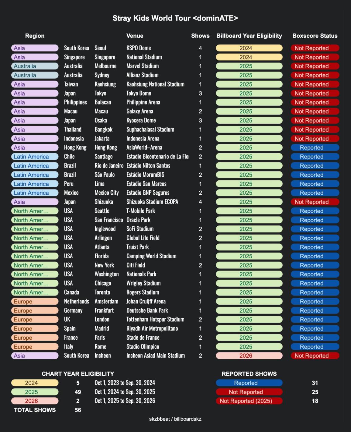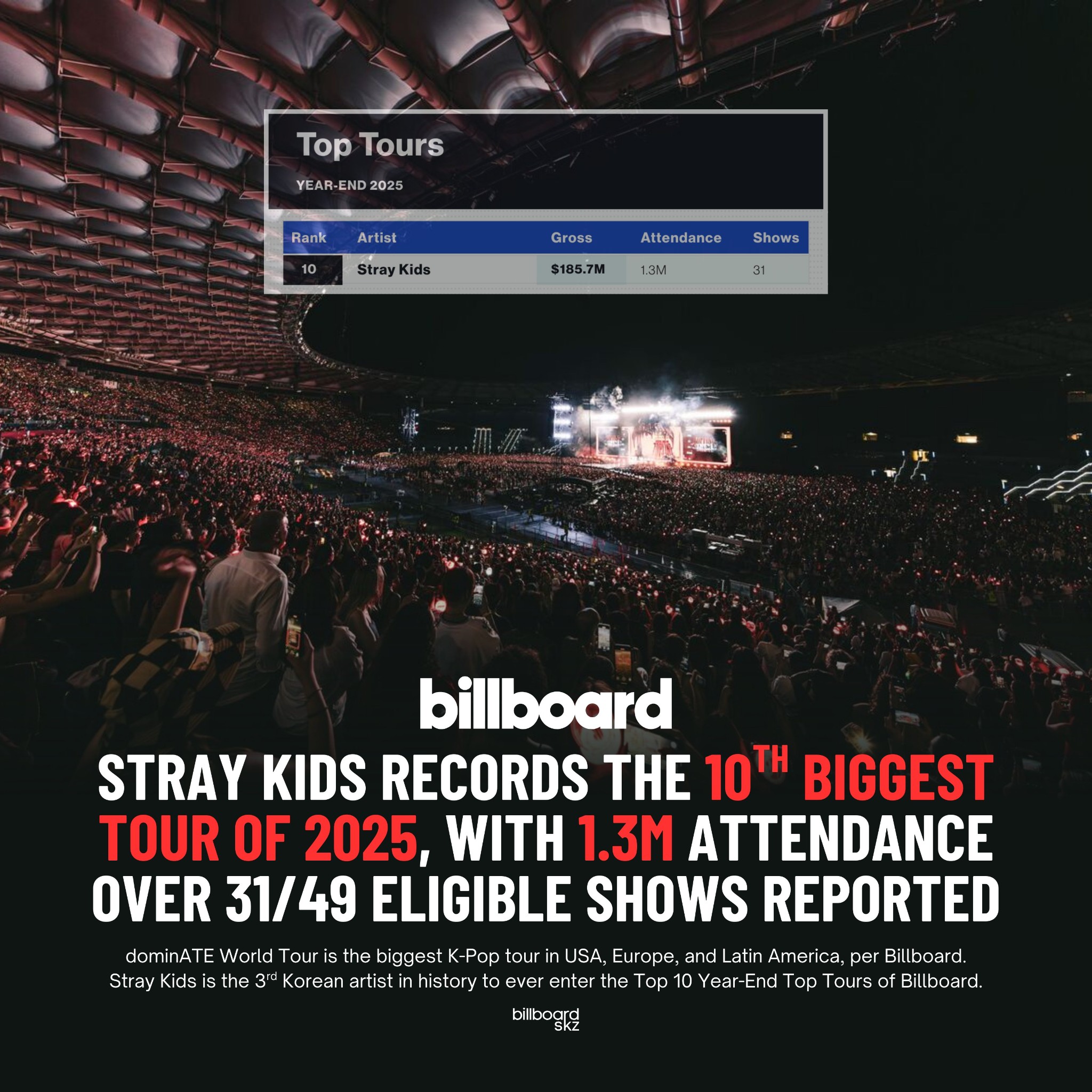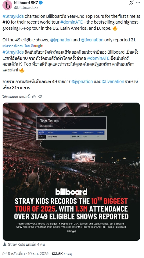 🔥 Stray Kids ทัวร์โลกอันดับ 1 K-Pop บน Billboard's Year-End Top Tours 2025 รายงานที่ 31 โชว์จากทั้งหมด 49 โชว์ ซึ่งการคลาดเคลื่อนนี้