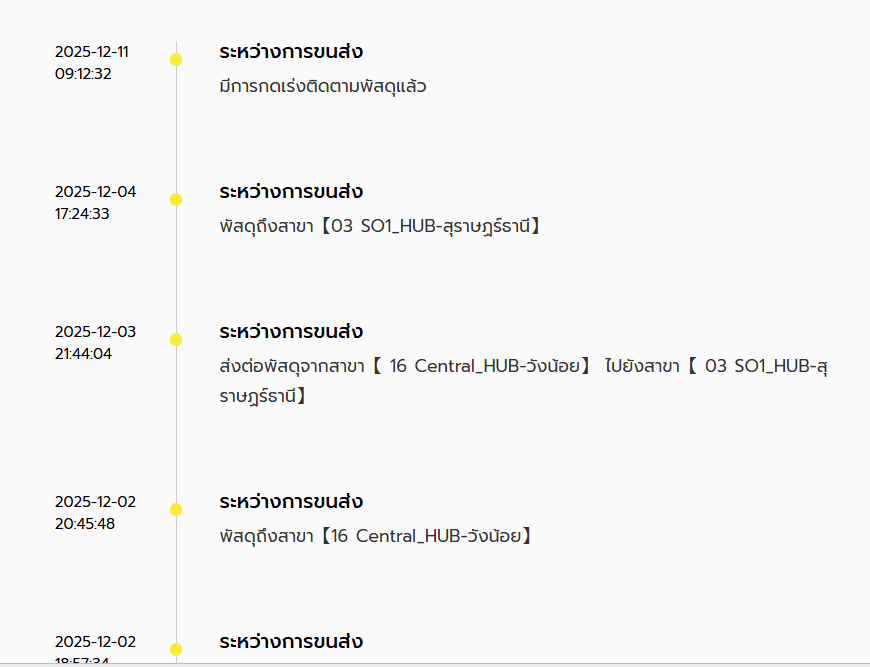 โคตรจะตลก ส่งของไปค้างเป็น 5 วันแล้วยังไม่คืบหน้า ทั้งที่ขนส่งอื่นที่ส่งไปพร้อมกันถึงเป็นชาติแล้ว ค้างอยู่ สุราษมา 5 วัน ติดตามก็ได้แค่เร่งพัสดุ ติดต่อก็โคตรจะยาก ผู้บริหารเป็นหัวแถวอย่างเดียว แก้ปัญหากี่โมง