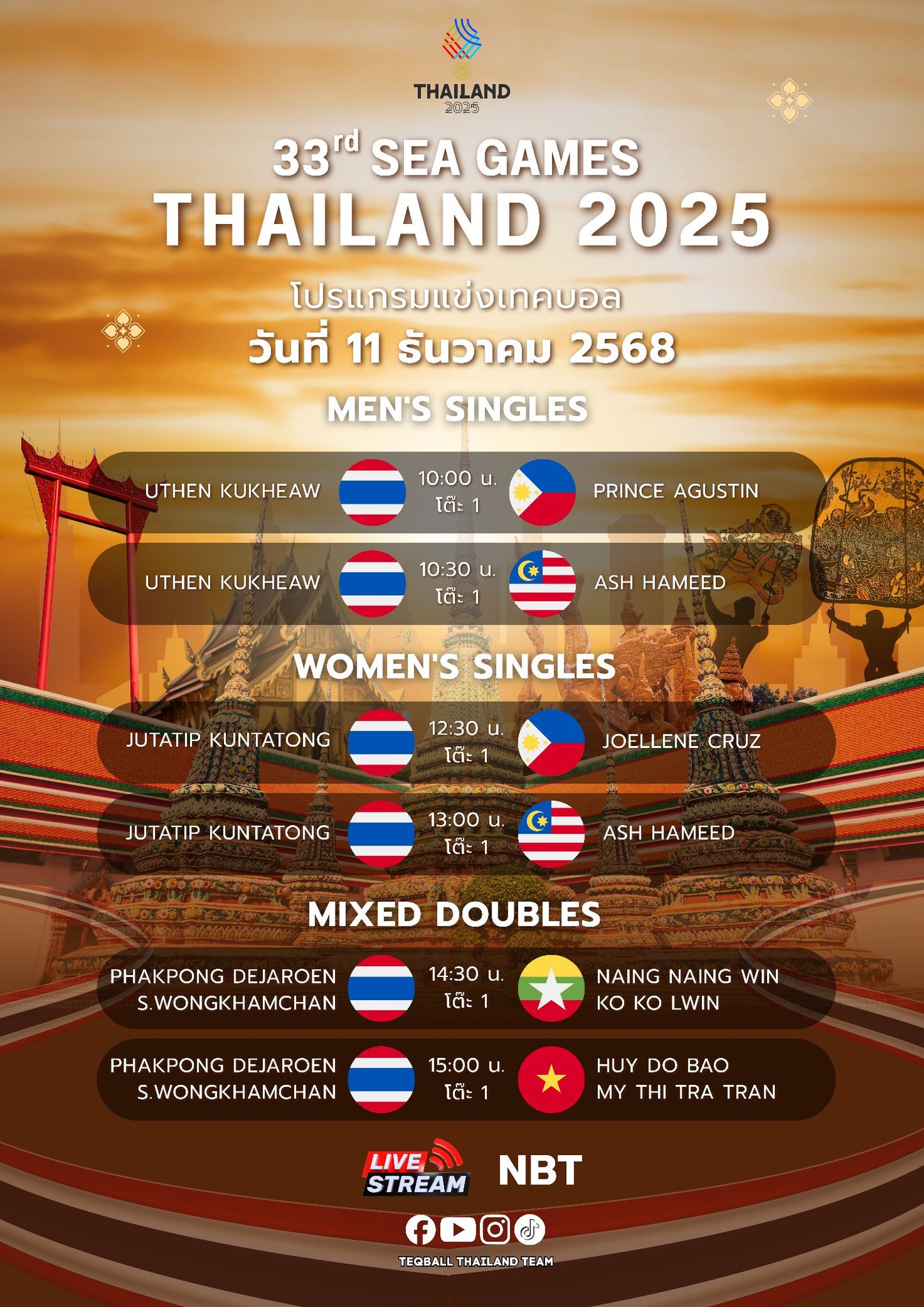 รายชื่อนักกีฬาในการแข่งขันเทคบอล กีฬาซีเกมส์ ครั้งที่ 33 และโปรแกรมการแข่งขัน วันที่ 11 ธันวาคม 2568