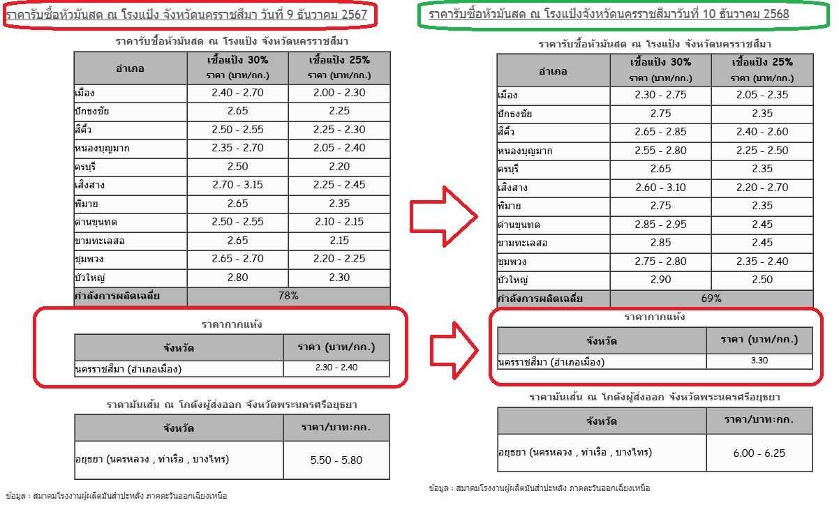 มันฯ ขาดตลาด โรงแป้งแย่งซื้อดันราคาพุ่ง จี้รัฐเปิดนำเข้า กันเสียตลาดส่งออก มันสำปะหลังขาดตลาด ลานมัน-โรงแป้งแย่งซื้อ ดันราคาพุ่ง 2.55 - 2.70 บาท/กก.นายกสมาคมการค้ามันฯ คาดการณ์ปี 68 ส่งออกผลิตภัณ