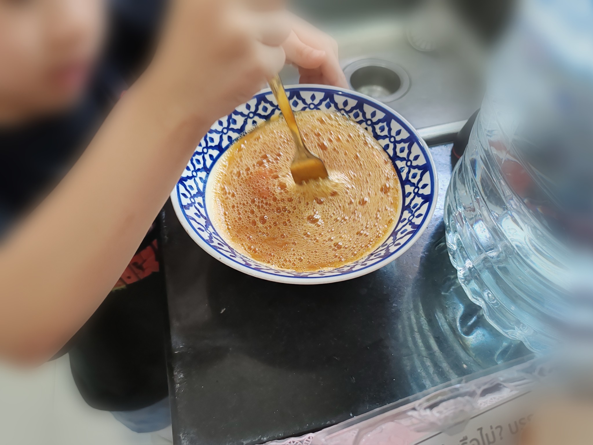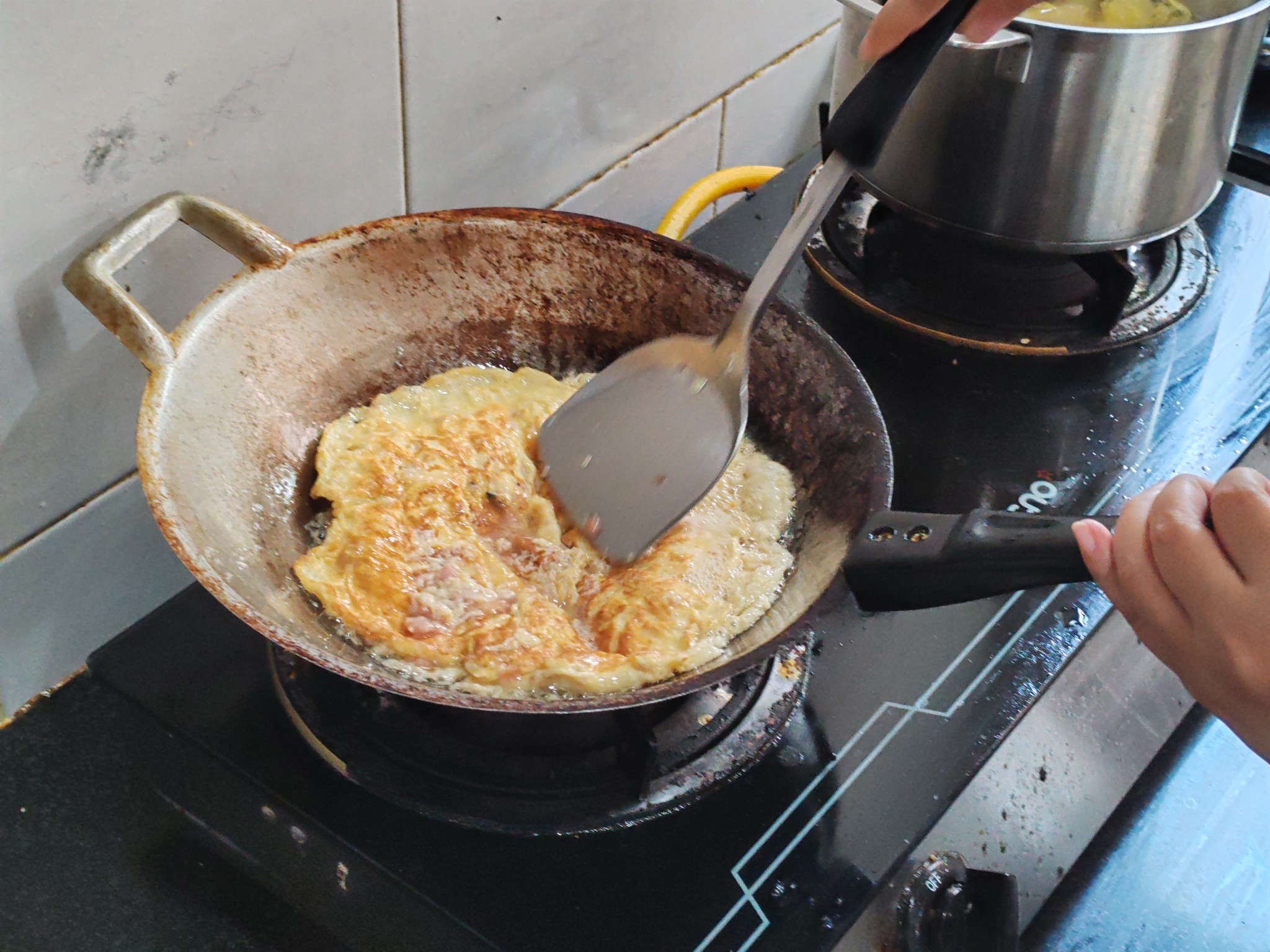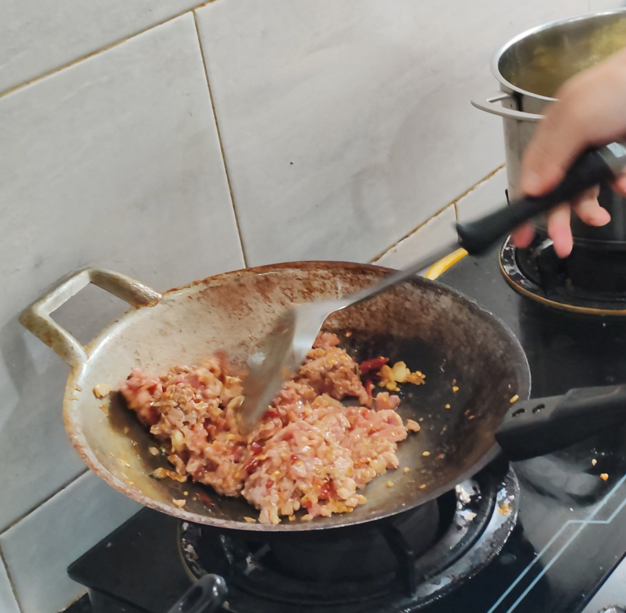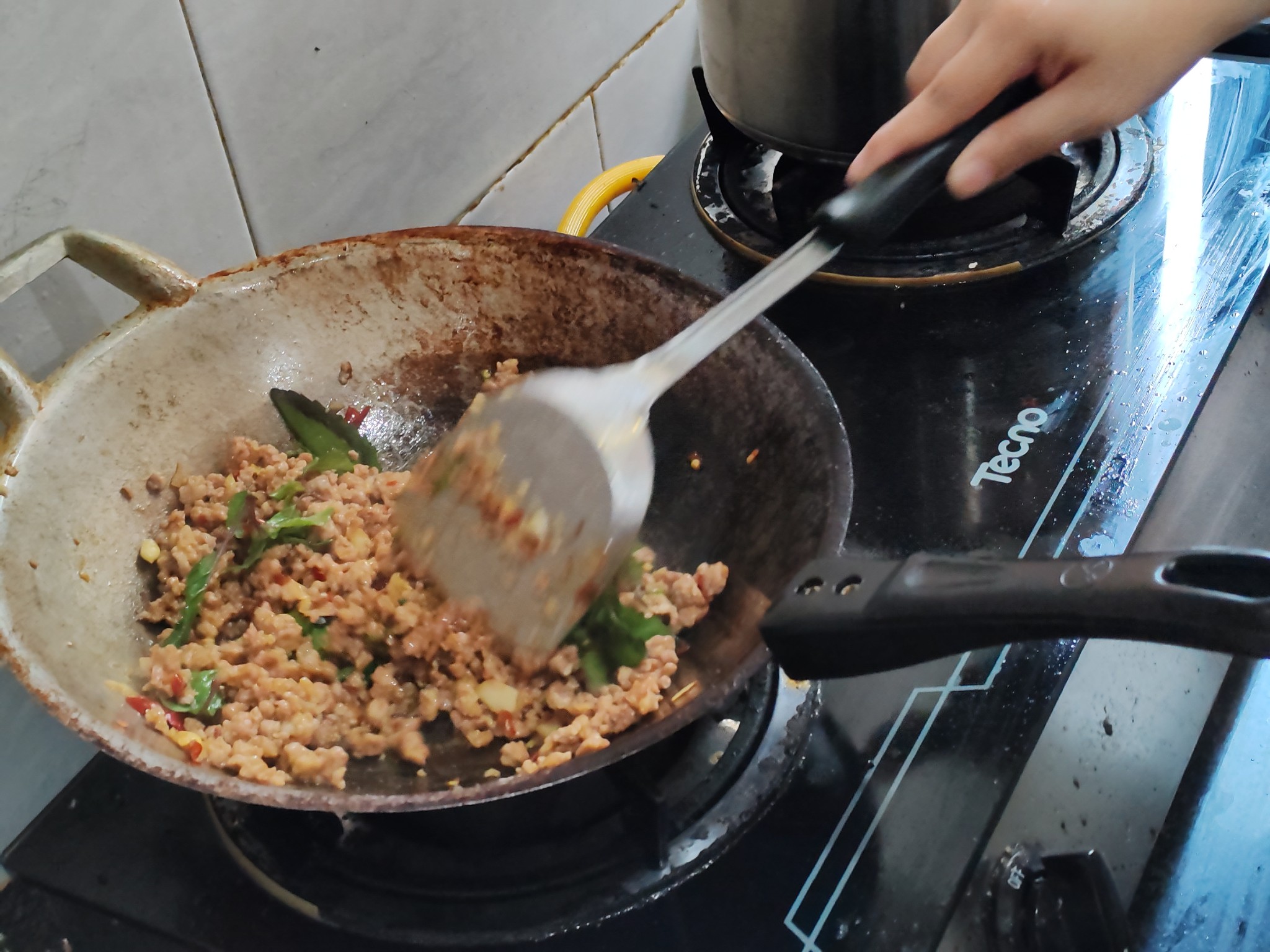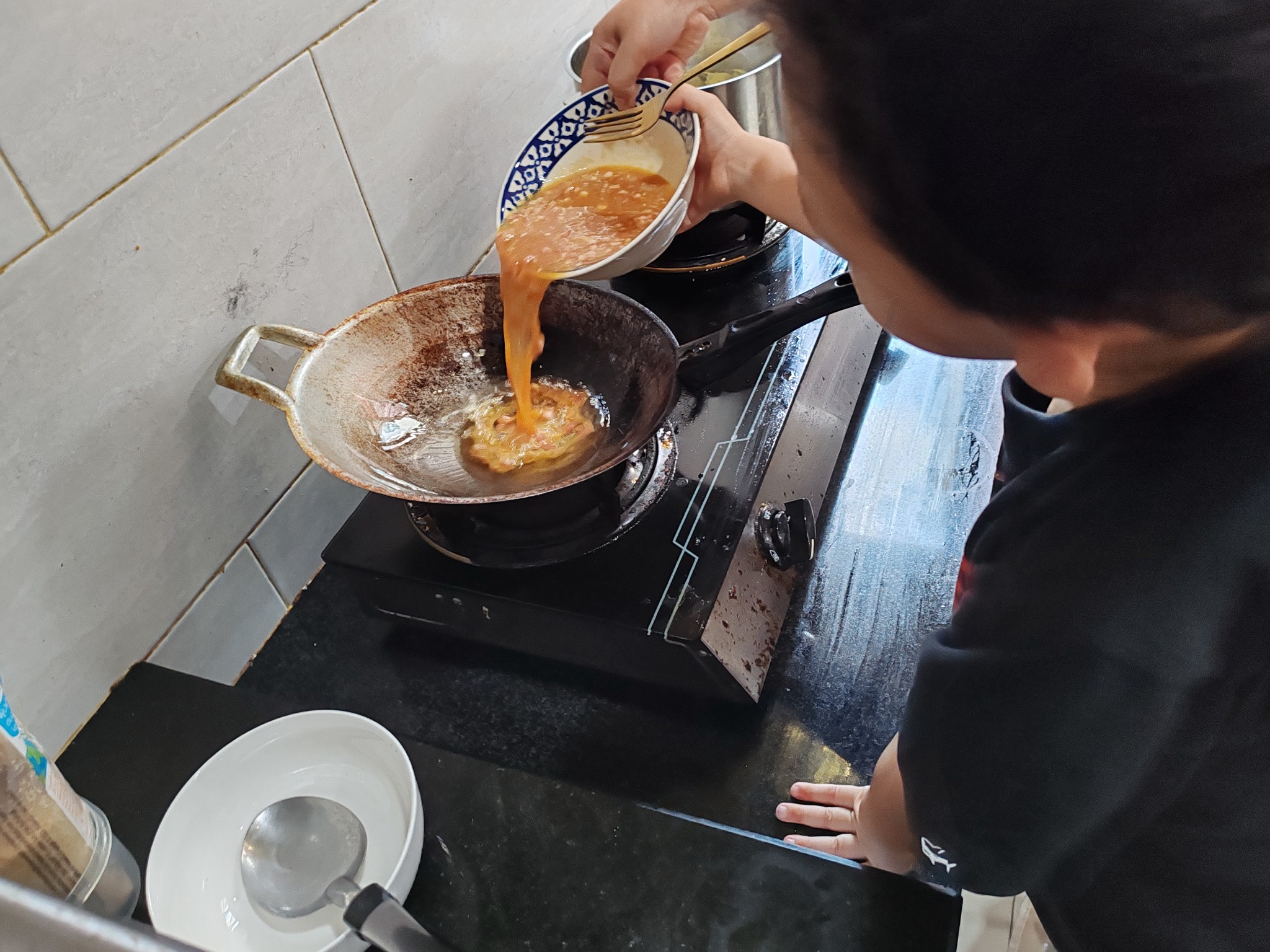 ใส่หมูสับ ปรุงรส เอ้าหนูช่วยตีไข่นะ ตีนะลูกไม่ใช่ กวน อันนี้มัน วนๆกวนๆ