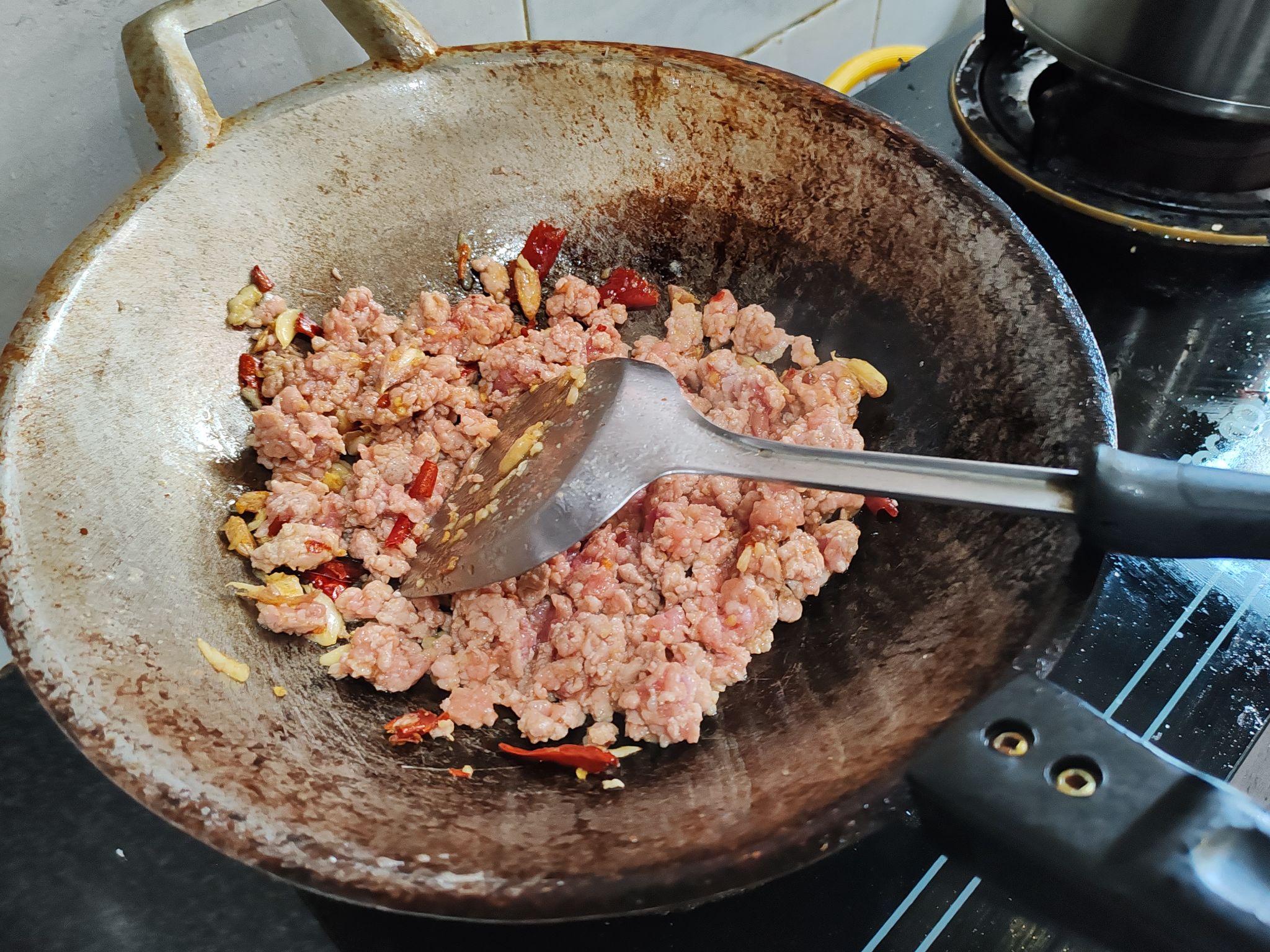 ตั้งกระทะ อย่าลืมเปิดไฟ 55 ใส่น้ำมัน ใส่พริกกระเทียม ลงไปผัด แล้วก็ใส่หมูสับ หลานยืนดูเฉยๆพอนะครับ