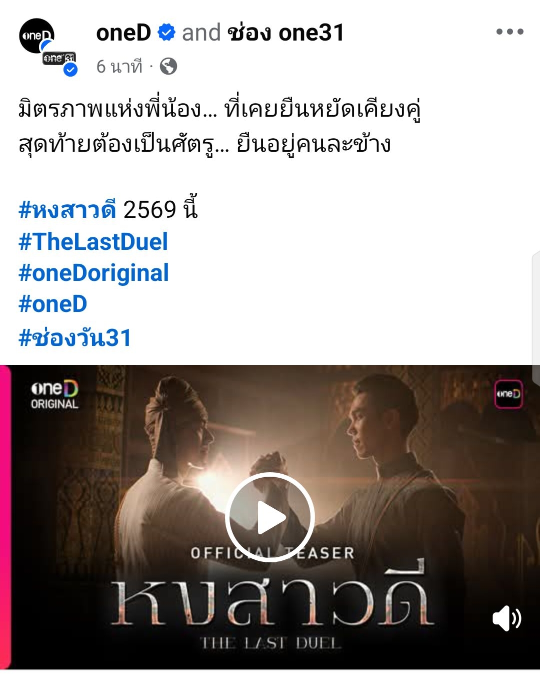 https://www.youtube.com/watch?v=tXXMJxXpZ7k มิตรภาพแห่งพี่น้อง… ที่เคยยืนหยัดเคียงคู่ สุดท้ายต้องเป็นศัตรู… ยืนอยู่คนละข้าง #หงสาวดี 2569 นี้ #TheLastDuel #oneDoriginal #oneD #ช่องวัน3