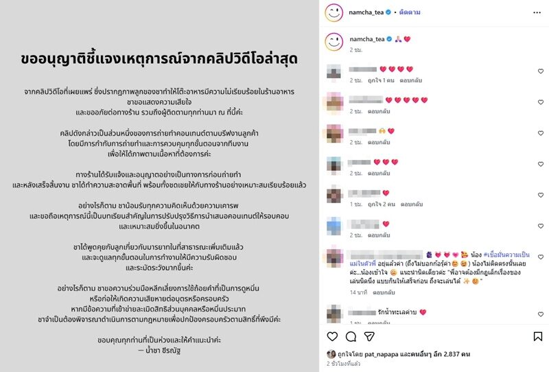 น้ำชา แจงเป็นคอนเทนต์ ปล่อยลูกเล่นในร้านอาหาร น้อมรับเป็นบทเรียนปรับปรุง