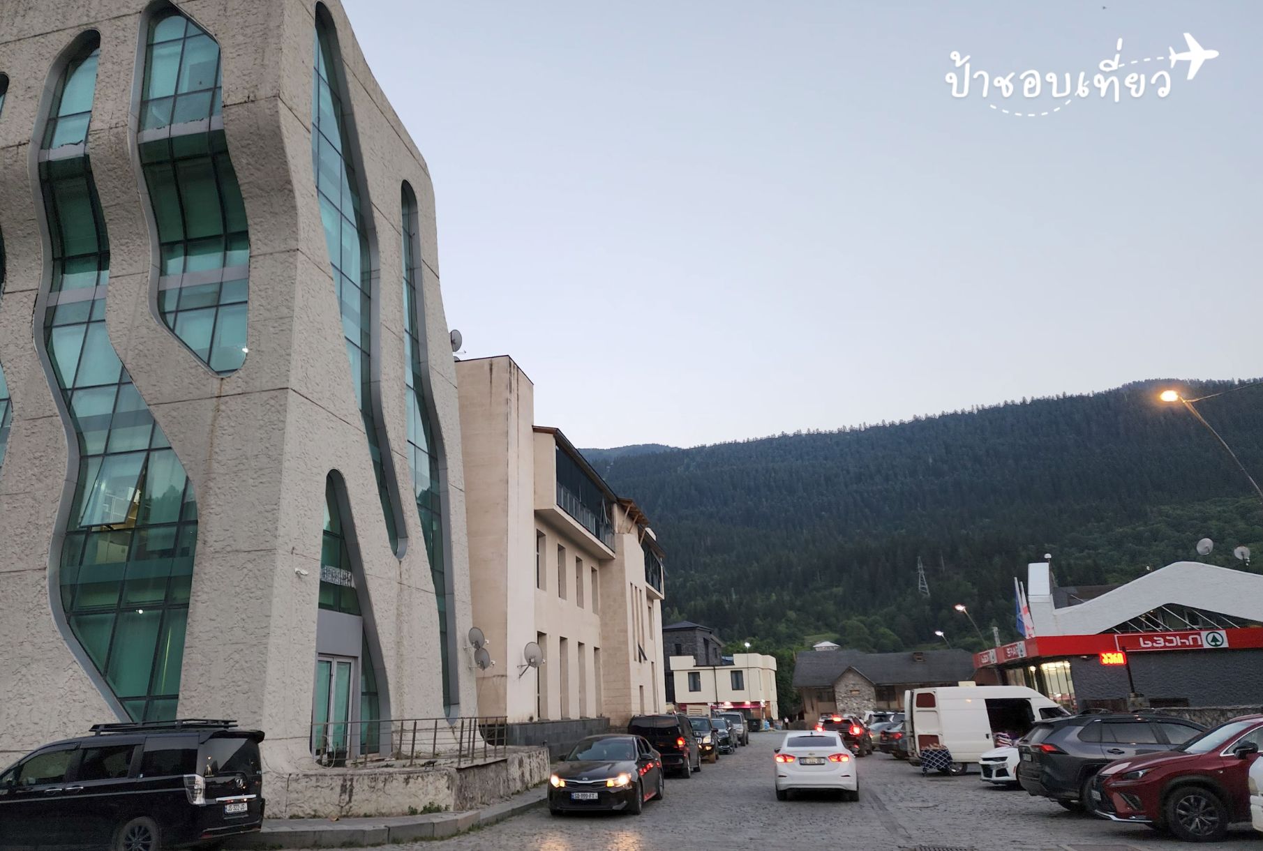 ด้านหน้าพิพิธภัณฑ์ มองเห็นยอดเขา Ushba ชัดเจน (ภูเขาที่มียอดน้ำแข็งที่มุมซ้ายของภาพ)