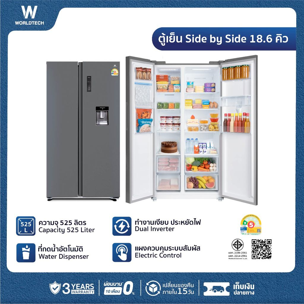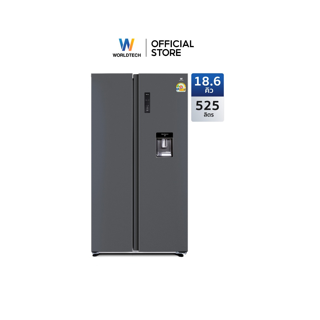 🧊❄️ Worldtech ตู้เย็น 2 ประตู 18.6 คิว Side by Side 525 ลิตร ประหยัดไฟเบอร์ 5 สำหรับครัวครอบครัวใหญ่ 🏡🍽️
