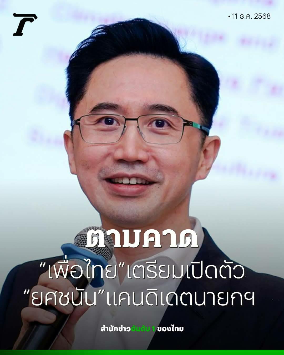 “เพื่อไทย เตรียมเปิดตัว“เชน” ยศชนัน บุตรชายนายสมชาย-เยาวภา วงศ์สวัสดิ์ นั่งแคนดิเดตนายกรัฐมนตรีตามคาด คู่ “จุลพันธ์” 16 ธันวาคมนี้