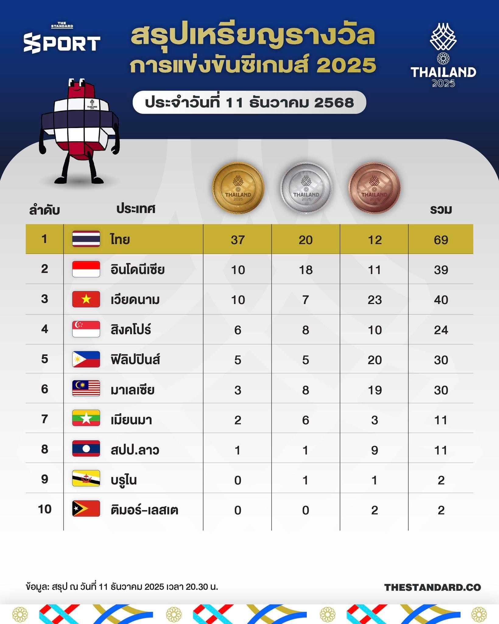 สรุปเหรียญรางวัลซีเกมส์ 2025 วันพฤหัสบดีที่ 11 ธันวาคม 2568 (วันที่ 2 ของการแข่งขัน) ว่าแต่ว่ามีอยู่ชาตินึงหายไป … 😂