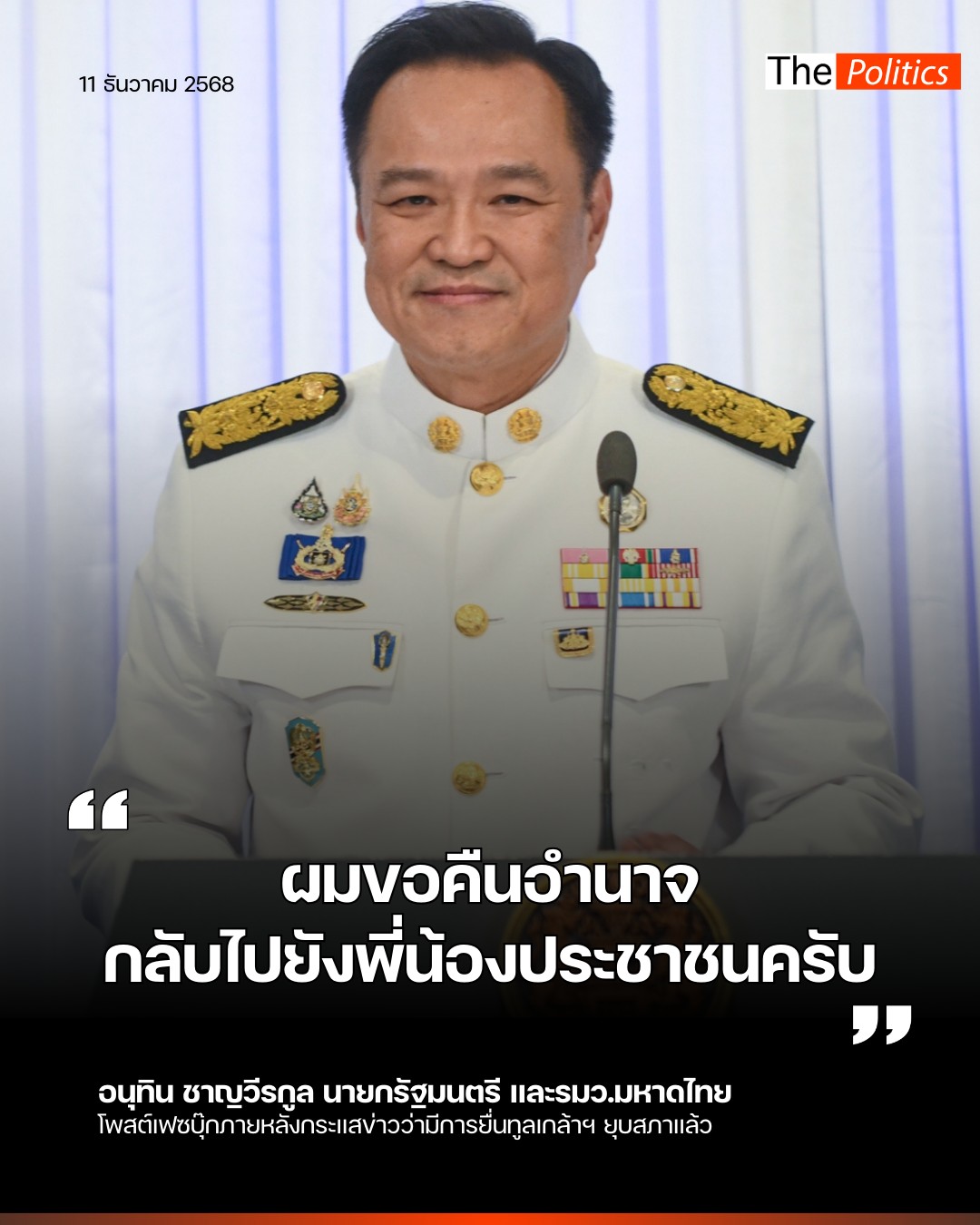 อนุทินประกาศยุบสภา เมื่อเวลา 22.05 น. วันที่ 11 ธ.ค. นายอนุทิน ชาญวีรกูล นายกรัฐมนตรี และรมว.มหาดไทย โพสต์เฟซบุ๊กส่วนตัว ระบุข้อความ “ผมขอคืนอำนาจกลับไปยังพี่น้องประชาชนครับ” ทั้งนี้ นาย