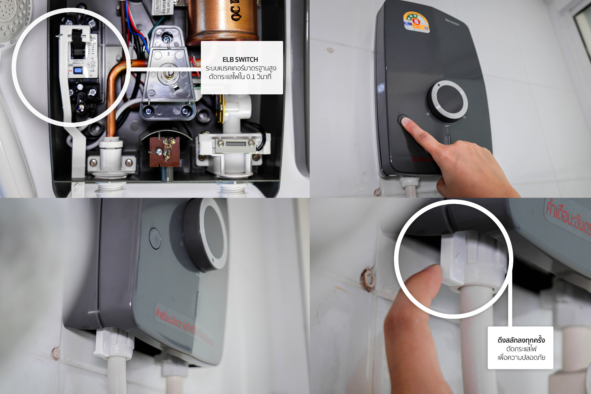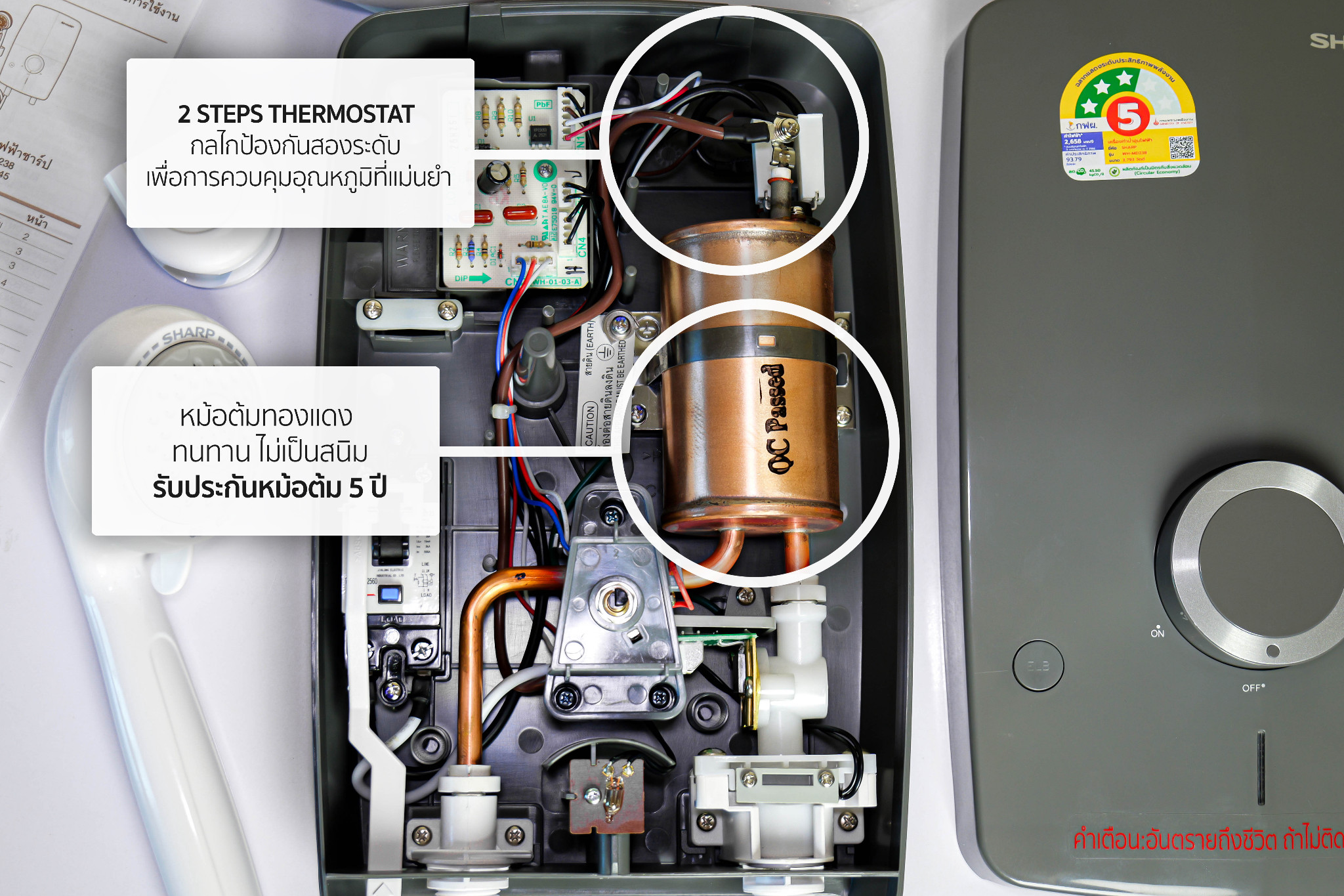 ในตัวเครื่องมีระบบ 2 Steps Thermostat ที่เป็นกลไกป้องกันสองระดับ เพื่อการควบคุมอุณหภูมิน้ำ