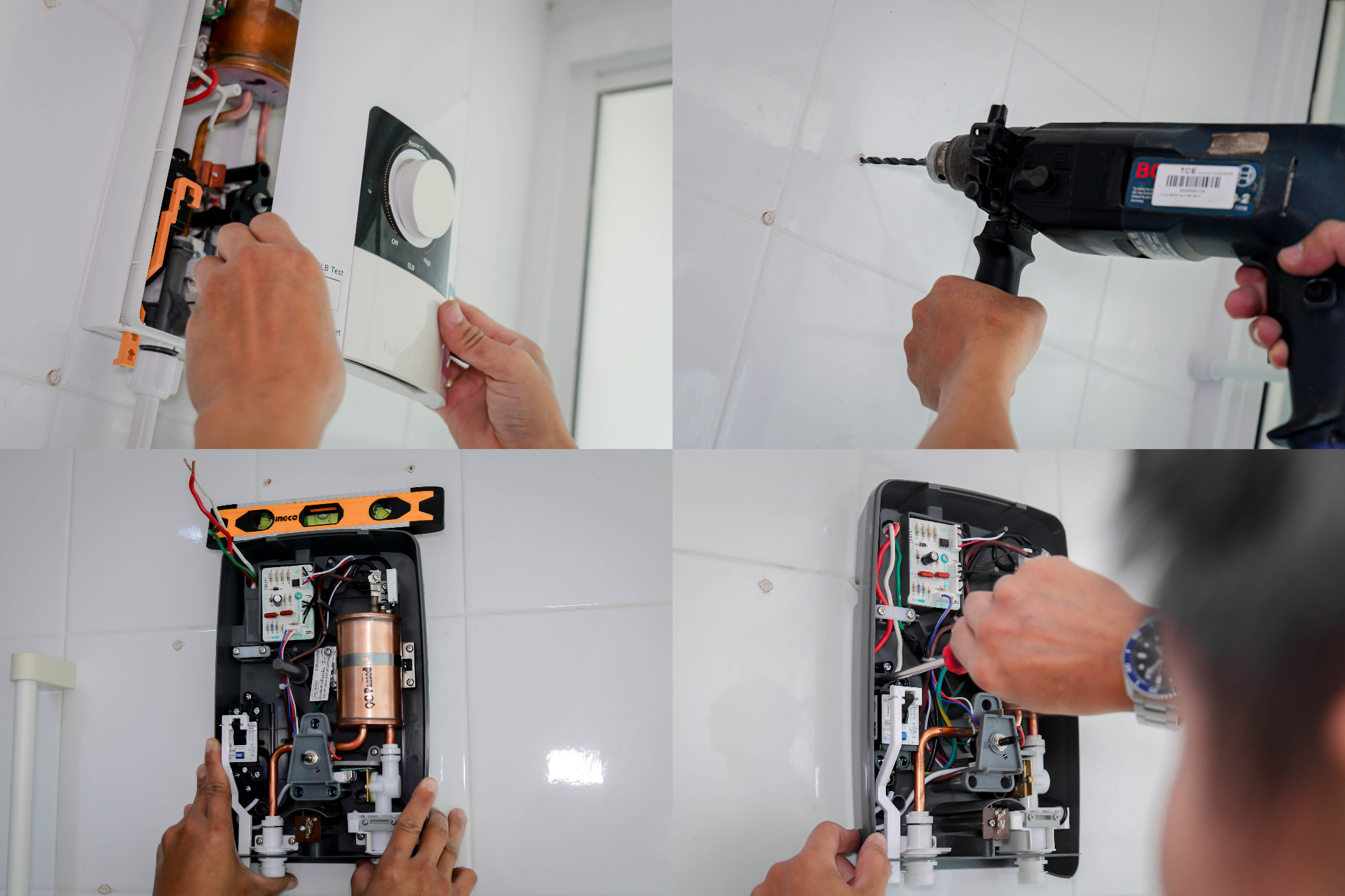 เราให้พี่ช่างถอดเครื่องเก่าออก แล้วให้เค้าทำการติดตั้ง ตัวเครื่องทำน้ำอุ่นชาร์ป MODI