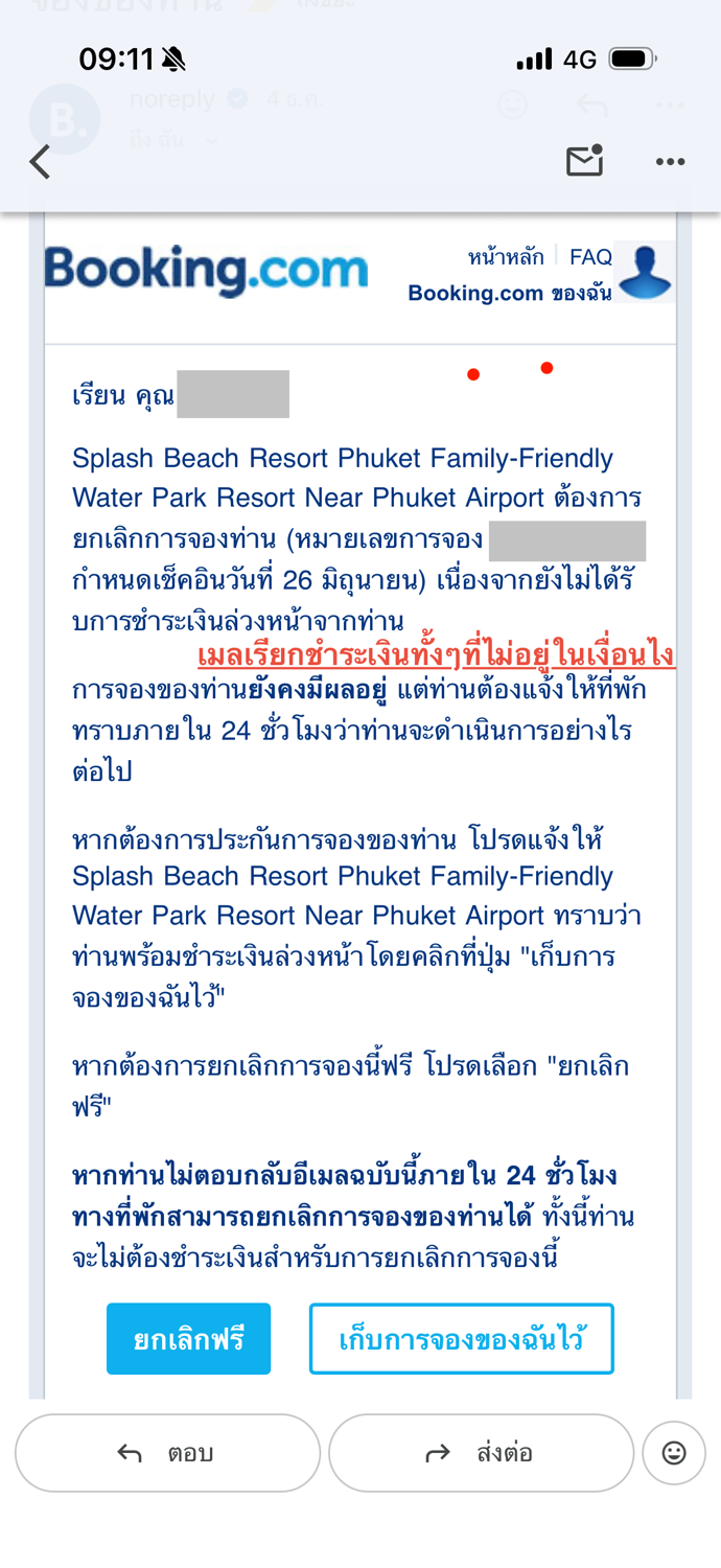 ••• เราโทรหา Booking.com ก็บอกว่า การจองเราปกติ ไม่มีการเรียกเงิน