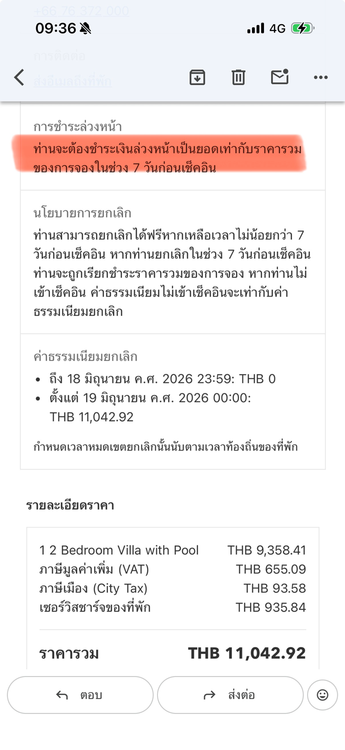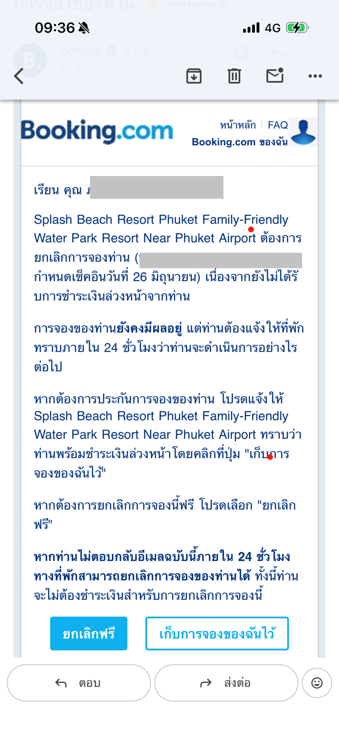 ยกเลิกการจองท่าน เนื่องจากยังไม่ได้รับการชำระเงินล่วงหน้าจากท่าน ทั้งๆที่เงื่อนไขชำระเงินไม่จำเป็นต้องจ่าย เราโทรหา Booking.com ก็บอกไม่อยู่ในเงื่อนไขที่ต้องจ่าย ( เราก็ งง เมล์มาจาก Booking.comนะ)