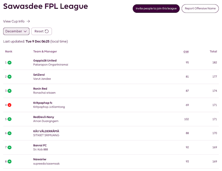 เดือน ธ.ค. เป็นเดือนที่แข่งกันสนุกมาก เพราะมีถึง 6 GWs โดยคะแนนยังสูสี จ่าฝูงเป็น “Gappio28 United” ที่กด BB ใน GW15 และมี 2 บรูโน่อยู่ในทีม โกยไปถึง 95 คะแนน แต่ยังไงต้องลุ้นกันต่อ ในอีกหลายวีคที่เหลือปลายปี