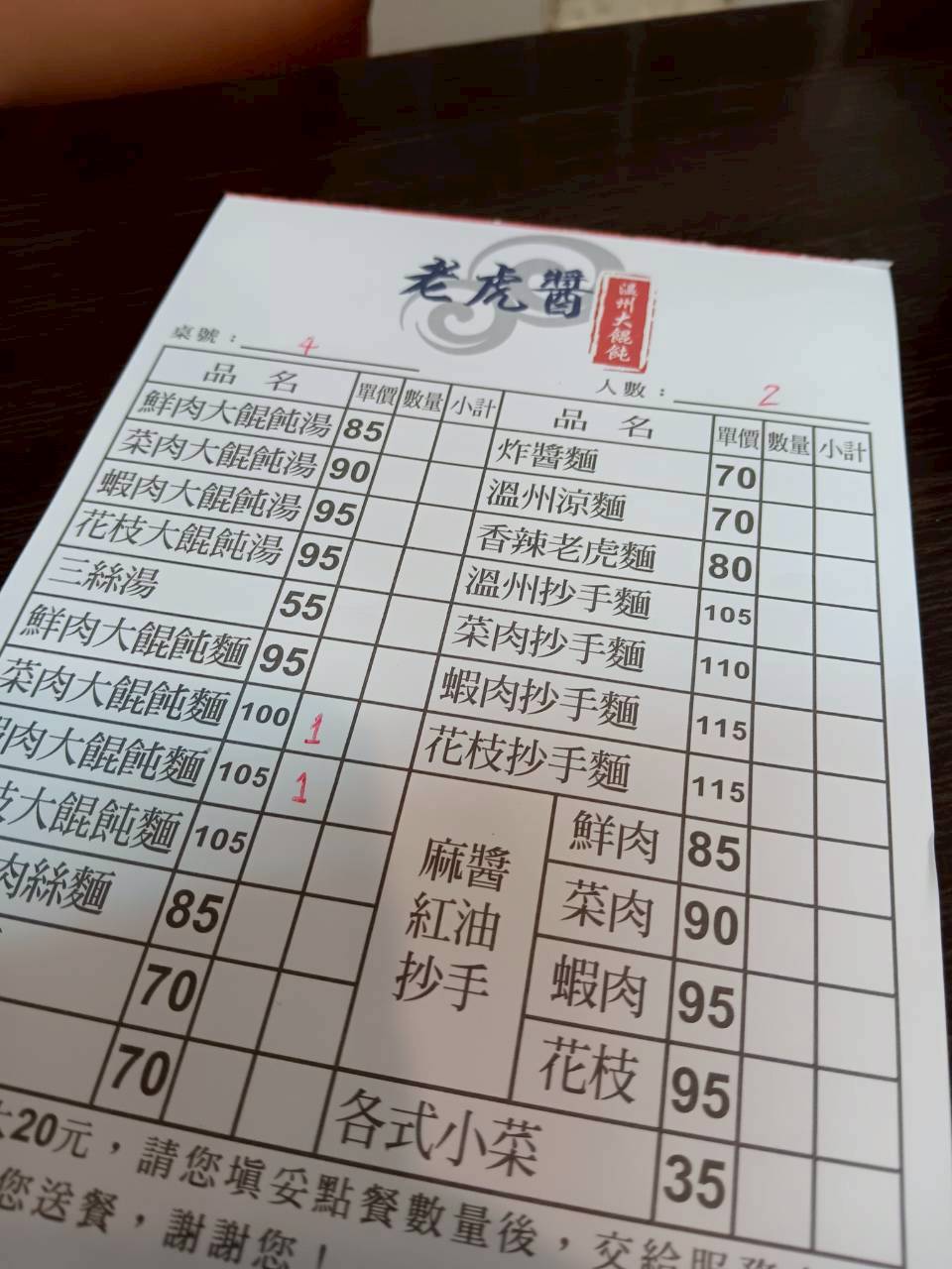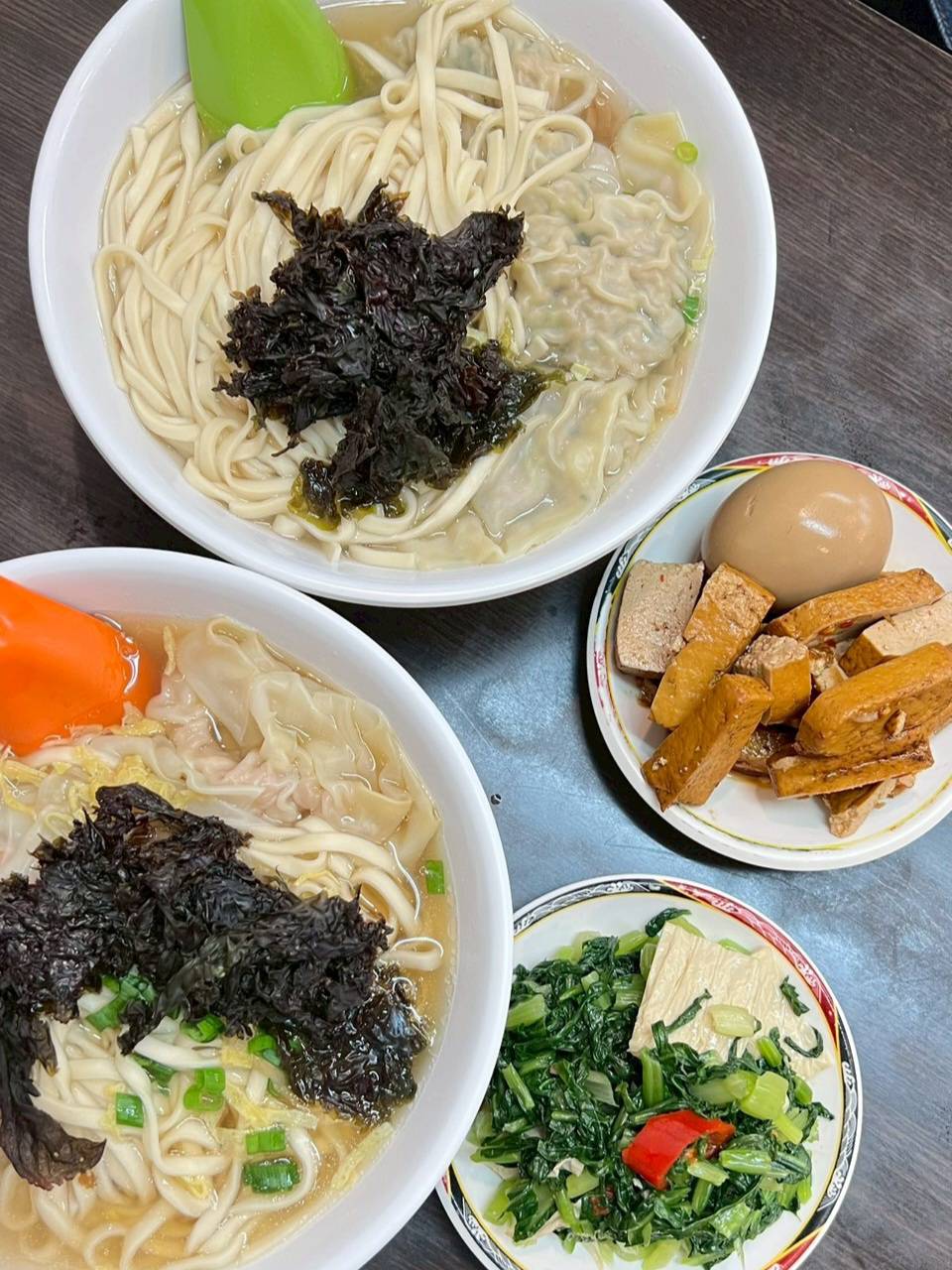ร้านนี้เหมือนเป็นร้านบะหมี่ทำเอง เกี๊ยวห่อเอง ชามละเกือบ ๆ 100 NTD บริเวณกลางร้านมีเครื่องเคียงเป็นจานเล็ก ๆ วางไว้เรียงราย ใส่จานเล็กๆ คล้ายพวกร้านติ่มซำ สามารถไปหยิบได้เอง จานละ 35 NTD เราจึงสั่งบะหมี่เกี๊ยวมาคนละชาม คุณผู้หญิงหยิบเครื่องเคียงเป็นผักสีเขียวซอย คล้ายกับใบกุยช่าย ส่วนผมหยิบไข่และเต้าหู้ต้มสมุนไพร คล้ายกับไข่พะโล้มาก ๆ พอได้ลองกินคำแรก มันก็คือไข่พะโล้และเต้าหู้ในไข่พะโล้จริง ๆ นั่นแหละ ส่วนบะหมี่นั้นชามใหญ่มาก ใส่เกี๊ยวมาให้ประมาณ 4 ชิ้น แต่รสชาติก็เป็นสไตล์เดิมนั่นคือ รสชาติมาแบบน้ำซุปเปล่าๆ จืด ๆ ต้องนำมาปรุงเปรี้ยว ปรุงเผ็ด ตามสไตล์อร่อยทุกถุงเพราะปรุงเอง