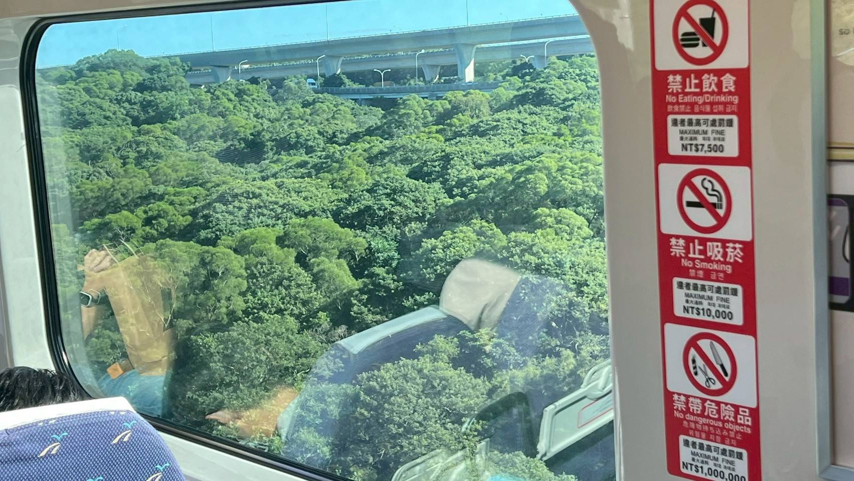 ใช้เวลาประมาณ 40 นาที ในการนั่งรถจากไทเปสู่สนามบินเถาหยวน นั่งรถขบวน Express สีม่วง เช่นเดียวกับขามา ที่จะจอดเพียงแค่ 3 สถานีเท่านั้น ระหว่างทางเราได้ลองใช้เวลาสังเกตรายละเอียดบ้านเมืองแถบชนบทดู เพราะขามาวันแรกนั้น เรามัวแต่ตื่นเต้นกับสิ่งรอบตัวจนไม่ได้ชมบรรยากาศภายนอกเลย