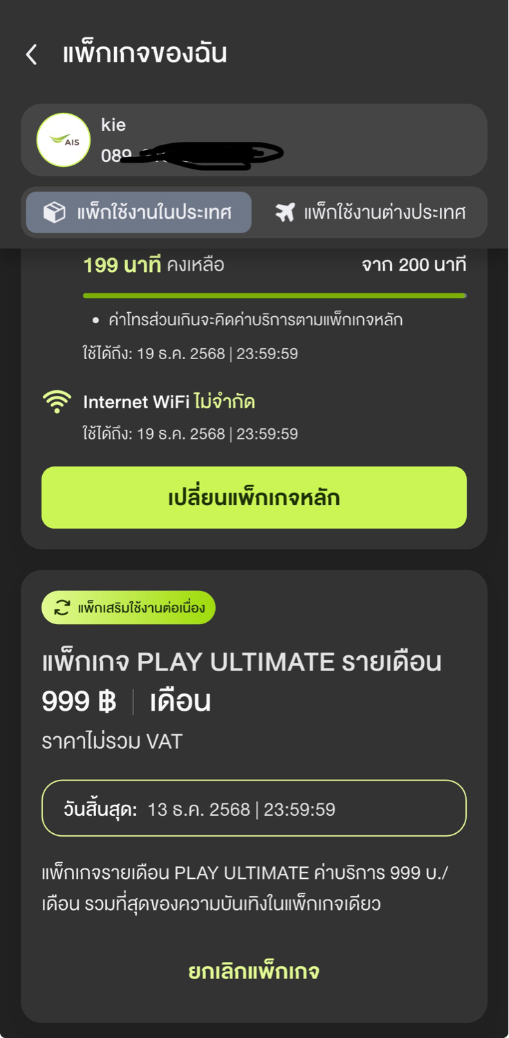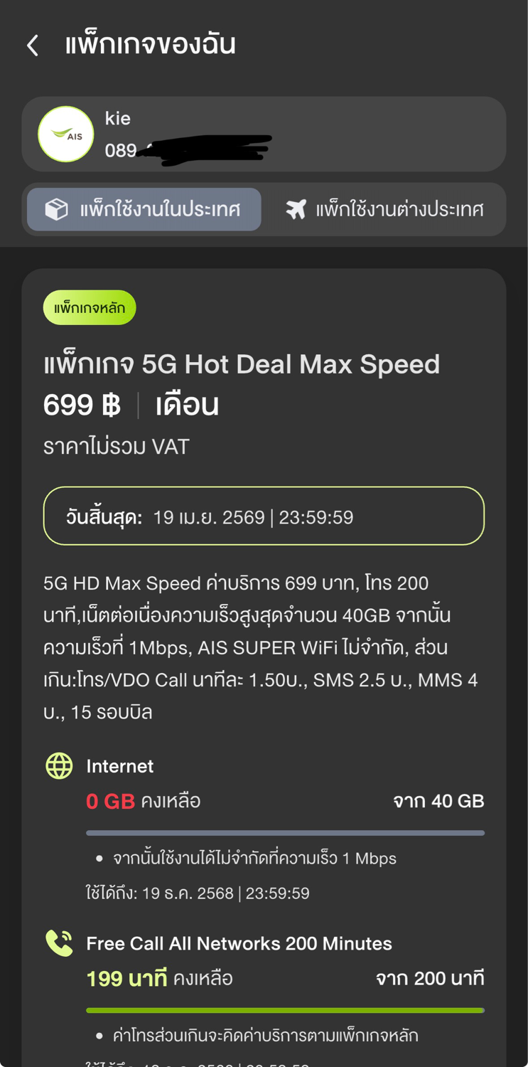 พอดีตอนนี้ใช้แพ็กเกจ 5G รายเดือนอยู่ที่ 699 ได้ 40gb + สมัครแพ็กเกจเสริม PLAY UNTIMATE 999 ไว้ดู Streaming ด้วย พอใช้ไปใช้มาใช้ไปไม่ถึงเดือนก็หมด แล้วต้องสมัครแพ็กเกจเสริมทุกเดือน ถึงจะพอต่อการใช้งาน