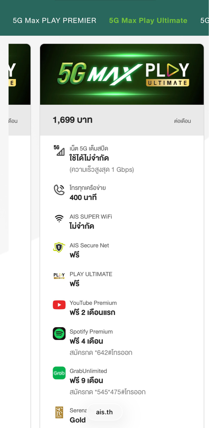 แล้วพอดีเห็นแพ็กเกจ internet unlimited + Streaming 5G Max Play Untimate ในราคา 1699 ซึ่งราคาเท่ากับที่ใช้อยู่ในปัจจุบัน แล้วเราโทรไปสอบถามทาง call center 1148 ทางนั้นบอกว่า ตัวนี้มีไว้ให้ ลูกค้าใหม่ กับ ย้ายจากเติมเงินมาเม่านั้น ลูกค้าเก่าราจเดือนหมดสิทธิ์ ถ้าอยากใช้โปรนี้ค้องไปเปิดเบอร์ใหม่เท่านั้น