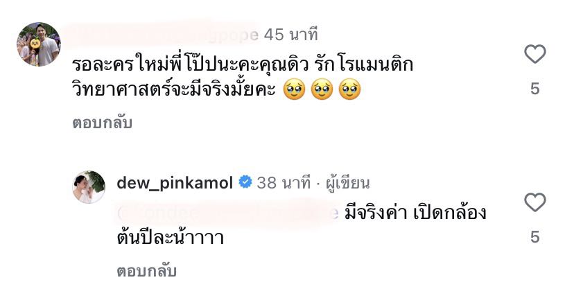เห็นคุณดิว ปิ่นกมลตอบคำถามแฟนคลับที่เข้ามาคอมเม้นท์ถามถึงละครใหม่พี่โป๊ป มีอยู่จริงหรือเปล่า…คุณดิวกล่าวว่า “มีจริงค่า เปิดกล้องต้นปีละน้าาาา”