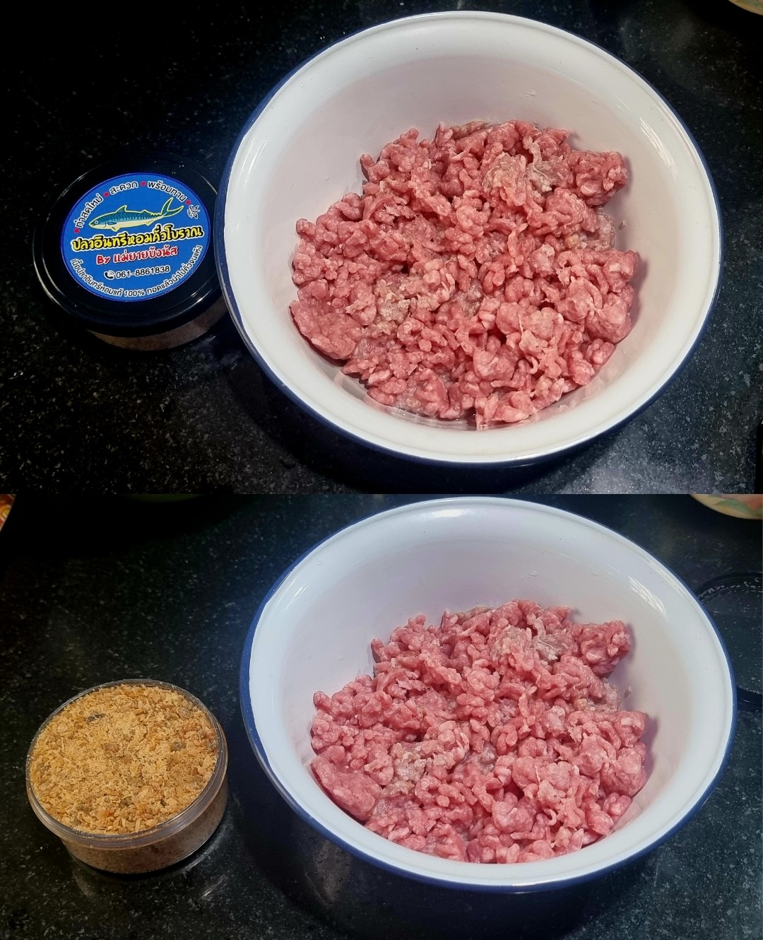 ผมใช้หมูบด , เนื้อปลาอินทรีบด , เนื้อปู ผสมกัน เติมผงปรุงรสตามชอบ , ใส่เหล้าจีนนิดหน่อย กับพริกไทย แค่นี้เลยครับ เนื้อปลาอินทรีมีความเค็มอยู่แล้ว ไม่ต้องใส่ซีอิ๊วขาวเพิ่มนะครับ
