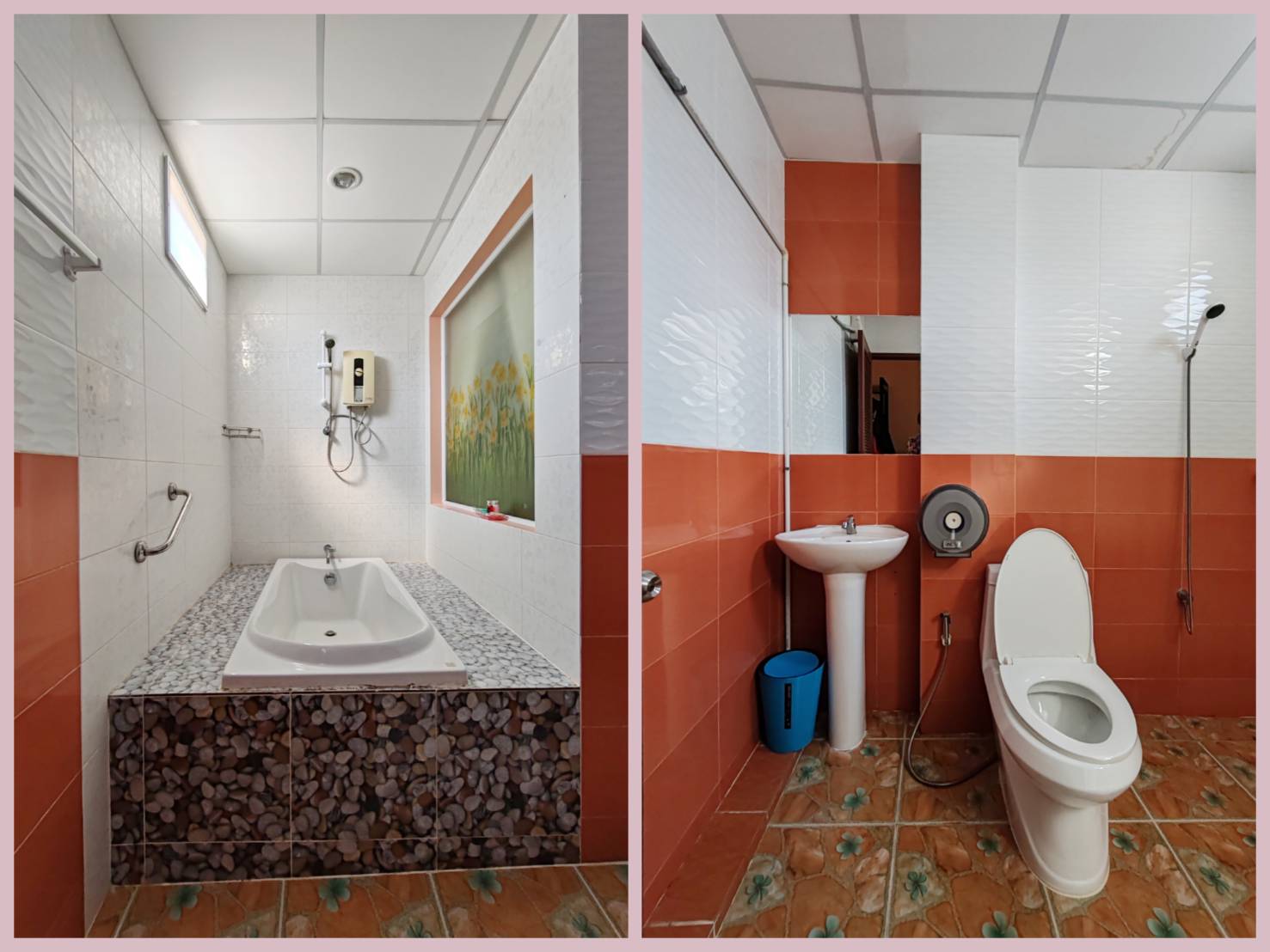 ห้องน้ำค่อนข้างกว้างและ มีสายชำระ มีแยกโซนที่มีอ่างอาบน้ำ ที่ยกพื้นไว้ค่อนข้างสูง
